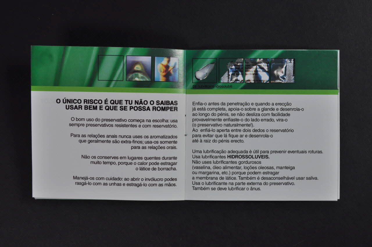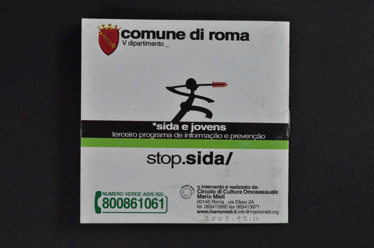 Brochure de format carré en papier blanc relié par une agrafe. La couverture est divisée en deux. La partie supérieure est sur fond blanc avec le logo de la commune de Rome, un dessin en ombre d'un soldat avec une lance recouverte d'une capote rouge. Au centre, un bandeau noir souligné de vert comporte un texte en blanc. La partie inférieure est sur fond vert avec un texte blanc et noir. A l'intérieur, un bandeau supérieur à fond vert comporte quelques petits photographies (préservatifs, scènettes ...). Dessous, sur fond blanc un texte explicatif avec quelques mentions en gras. Les cinq dernières pages donnent des informations pratiques et les coordonnées pour des tests, des associations, ...Inscriptions