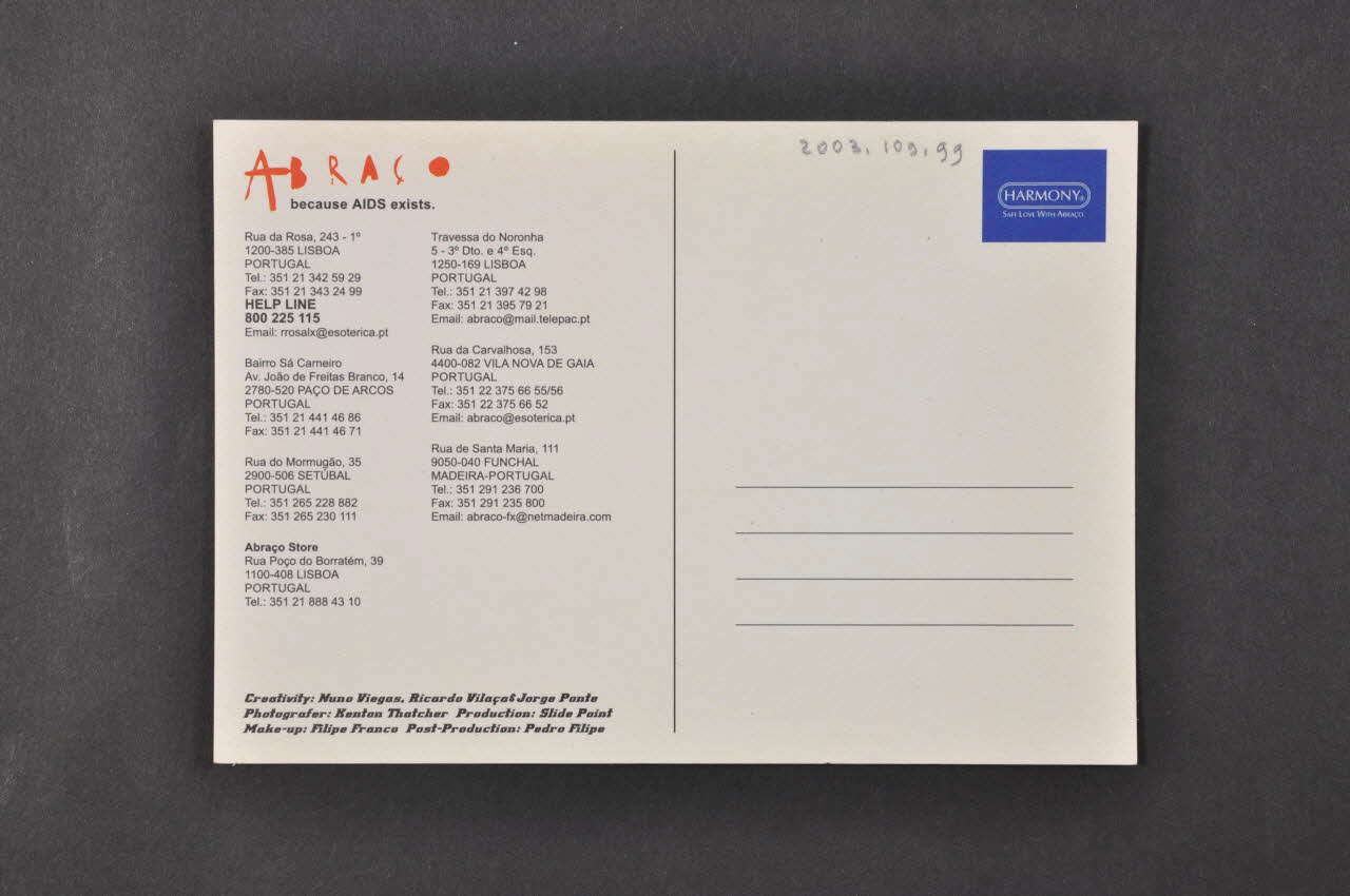 Des inscriptions encadrent la scène. Le verso est séparé en deux. A droite, figure un emplacement pour l'adresse et à l'emplacement du timbre est occupé par le logo d'Harmony (marque de préservatifs) Tout le côté gauche est occupé par les coordonnées des différents sièges d'Abraço : Lisbonne (et ligne directe) ; Paço de Arcos ; Setubal ; Vila Nova de Gaia ; Madeira.Inscriptions