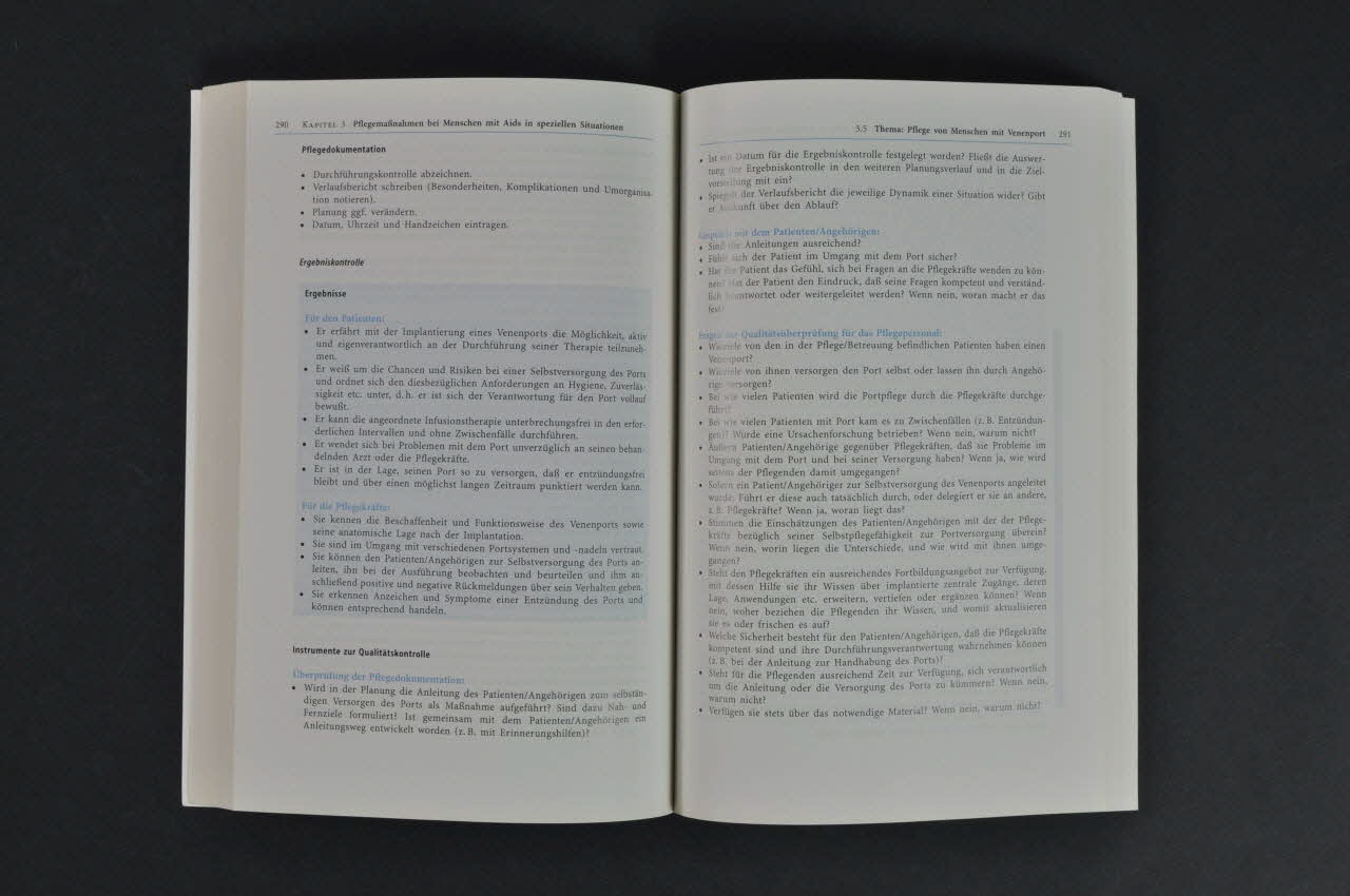 - Résumé des chapitres // 1. Einführung (Introduction) // 1.1 Das Gesundheitsversorgungsystem in Deutschland (Système de santé en Allemagne?) // 1.2 Pflegepraxis bei Menschen mit Aids oder : Pflege in der "Subkultur" // 1.3 Pflegeverständnis und Bedürfnisorientierung oder : Pflege ist Verhandlungssache // 1.4 Lehren und Lernen oder : Pflege im Gespräche // 1.5 Selbstpflege contra Fremdpflege oder : Pflegeplanung für Menschen mit Aids // 2 Pflegemassnahmen bei Menschen mit Aids zur Alltagsbewältigung // 2.1 Thema : Krankenbeobachtung (Observation des malades) // 2.2 Thema : Aktivierende Pflege (Soins actifs???) // 2.3 Thema : Waschen (toilette) // 2.4 Thema : Duschen (douche) // 2.5 Thema : Hautpflege (soins de la peau) // 2.6 Thema : Zahn - und Mundhygiene (Hygiène des dents et de la bouche) // 2.7 Thema : Maniküre / Pediküre // 2.8 Thema : Mobilisation // 2.9 Thema : Hygienemassnahmen und Infektionprophylaxe // 3 Pflegemassnahmen bei Menschen mit Aids in speziellen Situationen // 3.1 Thema : Anleitung von Laien, hier : Erläutern, An leiten, Üben und Durchführen einer pflegerischen Massnahme // 3.2 Thema : Pflege von Menschen mit einer Zytomegalieretinitis, hier Erlernen von selbständig durchzuführenden Alltagstätigkeiten bei Sehschwäche und Erblindung // 3.3 Thema : Durchführung der Infusionstherapie, hier : Anleitung des Patienten zum Anschliessen und Abnehmen seiner Infusion // 3.4 Thema : Pflege von Menschen mit venösem Zugang (Venenport, ZVK oder Braunüle), hier : Beteiligung des Patienten / Angehörigen am Verbandswechsel // 3.5 Thema : Pflege von Menschen mit Venenport, hier : Anleitung des Patienten zum Anlegen und Ziehen der Nadel // 3.6 Thema : Pflege von i.v. Drogenkonsumenten, hier : Substitutionvergabe // 3.7 Thema : Pflege von Menschen mit antiretroviraler Therapie, hier : Medikamentenvergabe und überwachung // 3.8 Thema : PcP Prophylaxe : hier : Anleitung des Patienten zur Inhalation mit Pentamidin- Isethionat // 3.9 Thema : Pflege von Sterbenden // 4 Pflege von Verstorbenen (Soins aux personnes décédées) // DéfinitionsLogo