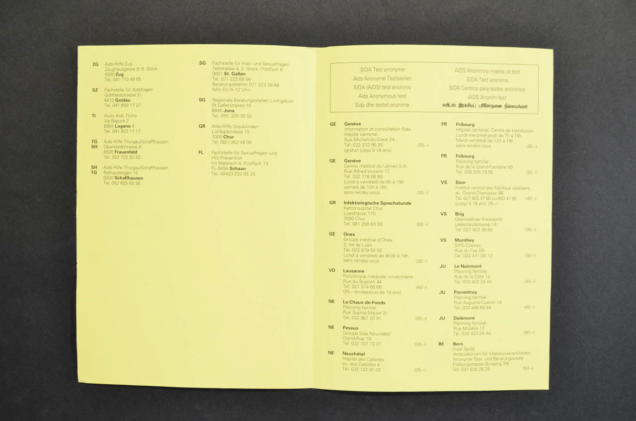 Sida maladies sexuellement transmissibles (en dix langues), sur la couvertureSIDA Test anonyme (en dix langues), à l'intérieurDécor