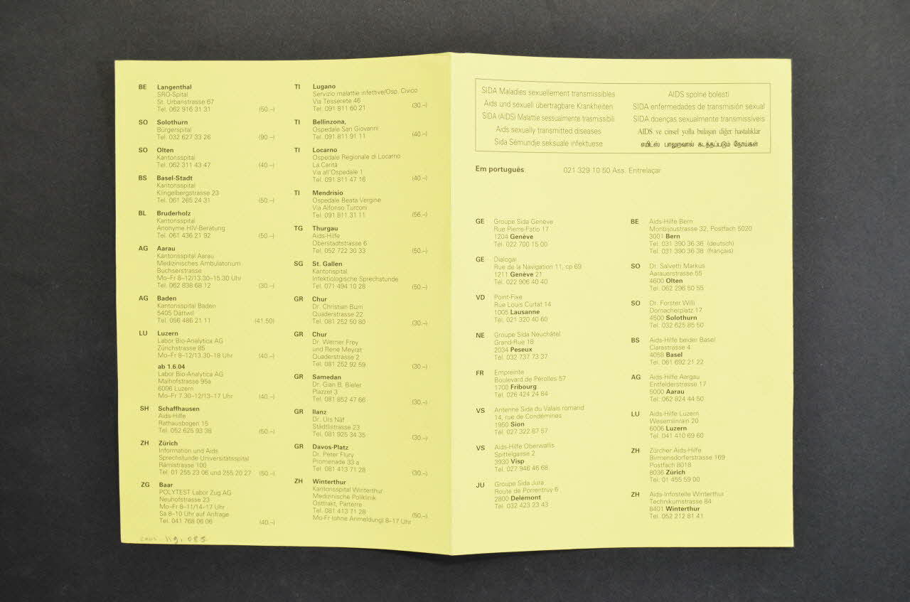 Feuillets 1 et 2 : Liste par canton suisse et coordonnées des associations ou personnes à qui s'adresser pour les maladies sexuellement transmissibles et numéro de ligne téléphonique en portugais. Feuillets 3 et 4 Liste par canton suisse et coordonnées des associations ou personnes à qui s'adresser pour le test de dépistage anonyme du sida