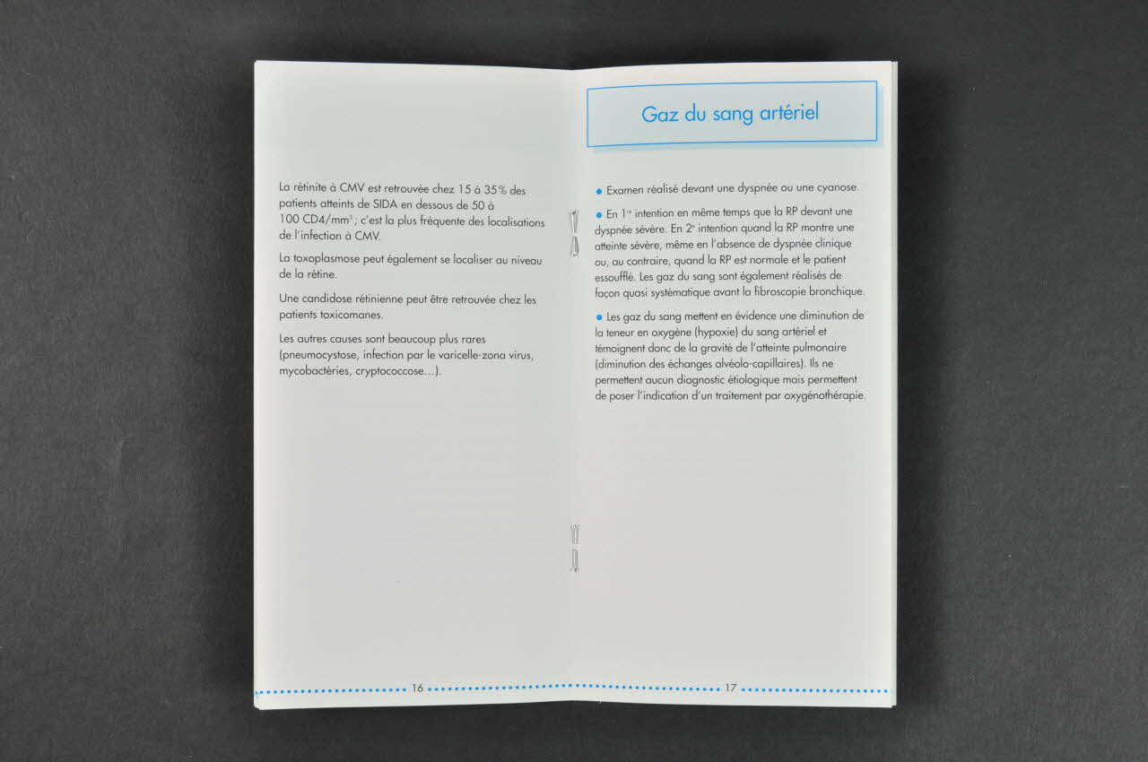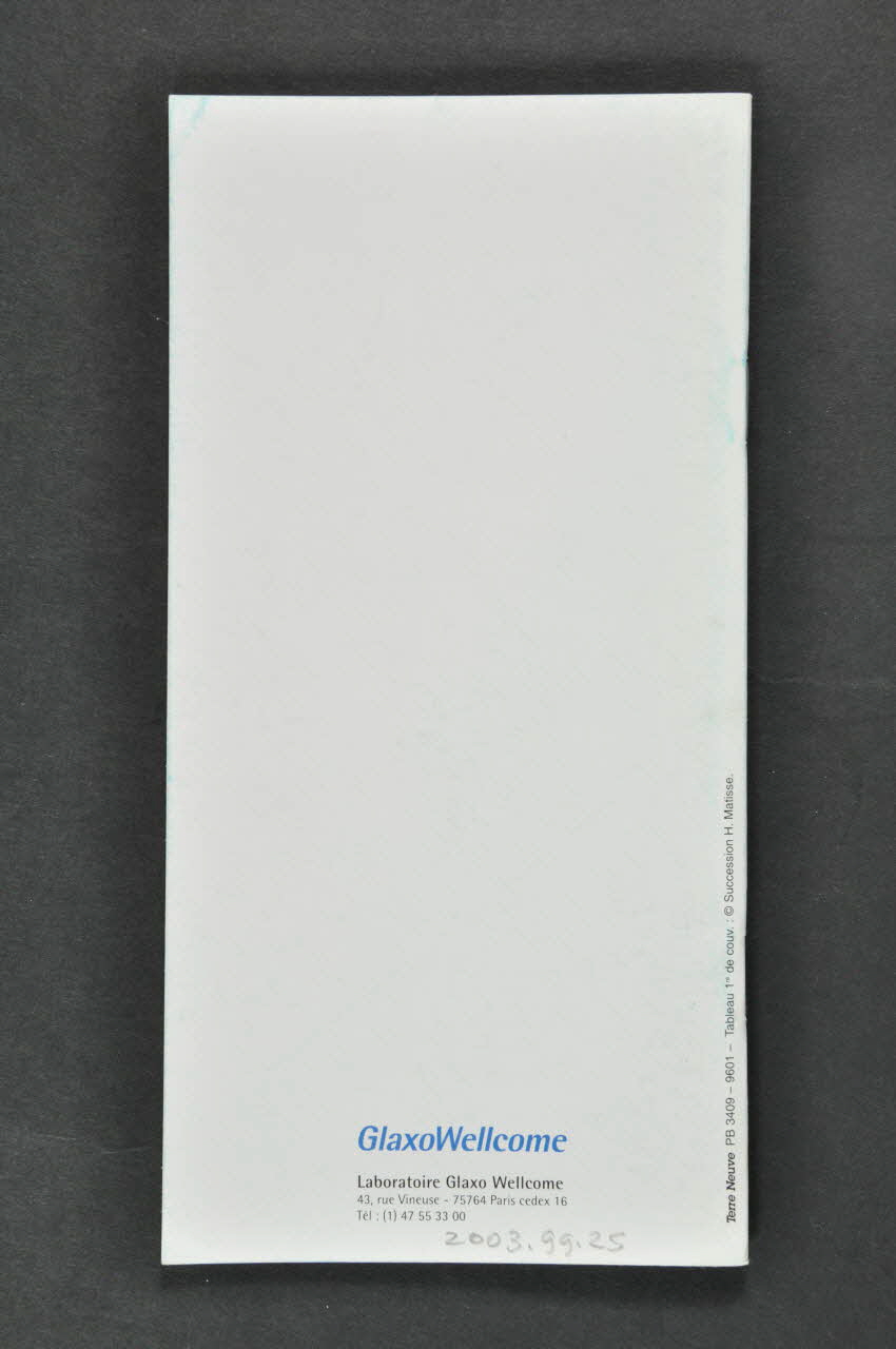 La couverture se compose du titre en capitales grises centré sur un fond blanc avec un liseré bleu. Dans la partie inférieure, il y a la reproduction dans une vignette du tableau de Henri Matisse "La ronde". Le verso présente dans sa partie inférieure les coordonnées du laboratoire Glaxo Wellcome. A l'intérieur, le texte est en noir précédé par le nom de l'examen médical en bleu dans un cadre bleu.Inscriptions