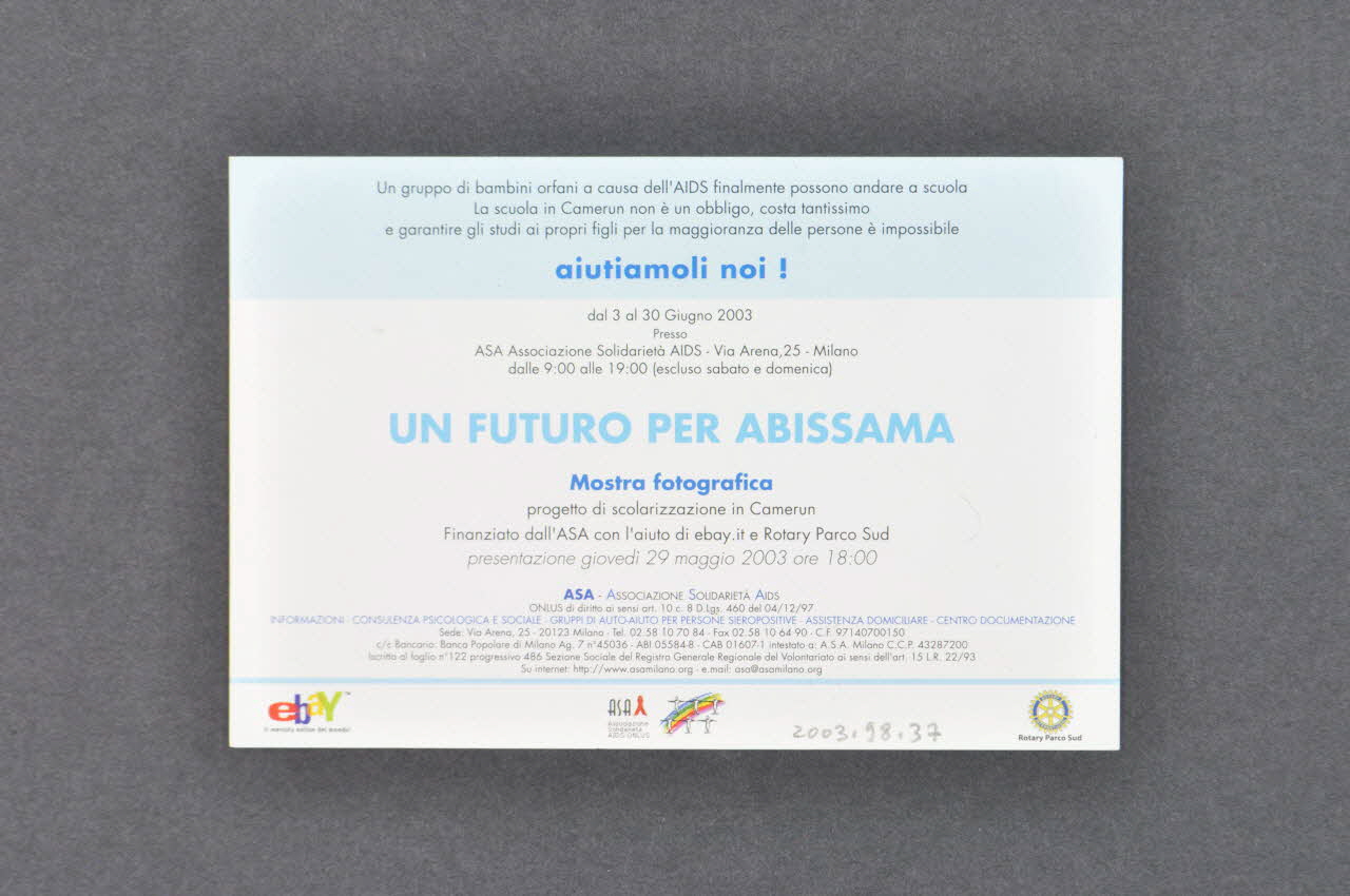 Le recto présente un fond bleu clair, encadrant une photographie. Celle-ci présente un enfant noir, vêtu d'une chemise en jean et d'un tablier vert, assis à un petit bureau dans une salle de classe ou de jeu, en train de dessiner. En bas, en capitales bleues, figure un slogan. Au dos, de nombreux textes sont imprimés en noir et bleu sur un fond bleu et blanc. Le bas du texte propose une invitation à l'exposition photographique "Un futuro per Abissama / Projet de scolarisation au Cameroun" au siège de l'association du 3 au 30 juin 2003, le 29 mai. En dessous, se trouvent les coordonnées de l'Association, ainsi que les logos de ebay, ASA, Rotary Parco Sud.Inscriptions