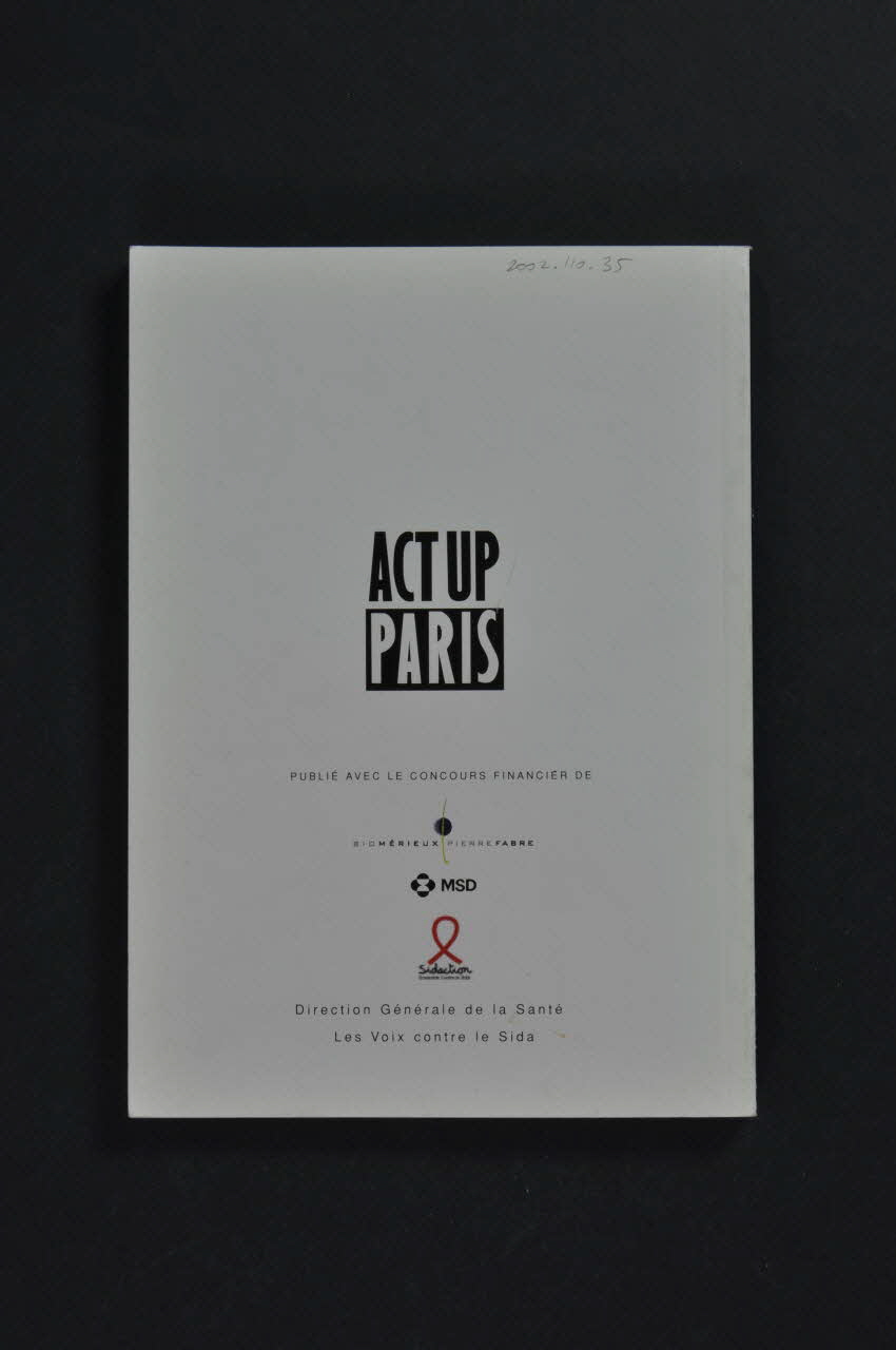 A l'intérieur de la dernière page de couverture, en vert verticalement : "Rejoignez Act Up-Paris". Et en caractères blancs sur noir: "Act Up -Paris été créé en 1989 par Didier Lestrade, Pascal Loubet et Luc Coulavin. Issue de la communauté homosexuelle, cette association a pour but de défendre toutes les populations touchées par le sida ainsi que d'informer les malades sur les traitements disponibles afin que ceux-ci participent pleinement à toute décision thérapeutique.