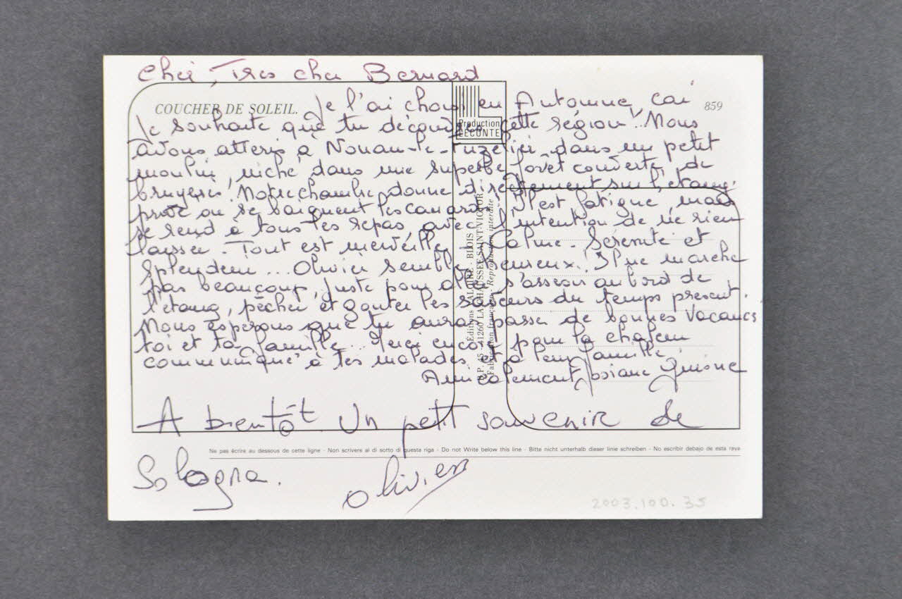 Cher, Très cher Bernard // Je l'ai choisi en Automne car // je souhaite que tu découvres cette région... Nous // avons atterri à Nouan-le Fuzelier dans un petit // moulin, niché dans une superbe forêt couverte de // bruyères. Notre chambre donne directement sur l'étang // privé où se baignent les canards. Il est fatigué, mais // se rend à tous les repas avec l'intention de ne rien // laissée. Tout est merveille...Calme, sérénité et // splendeur... Olivier semble heureux. Il ne marche // pas beaucoup, juste pour aller s'asseoir au bord de // l'étang, pêcher et goûter les saveurs du temps présent. // Nous espérons que tu auras passé de bonnes vacances, // toi et ta famille. Merci encore pour la chaleur // communiquée à tes malades et à leur famille. // Amicalement. Josiane Quisne // A bientôt un petit souvenir de Sologne // Olivier (manuscrite), versoLogo