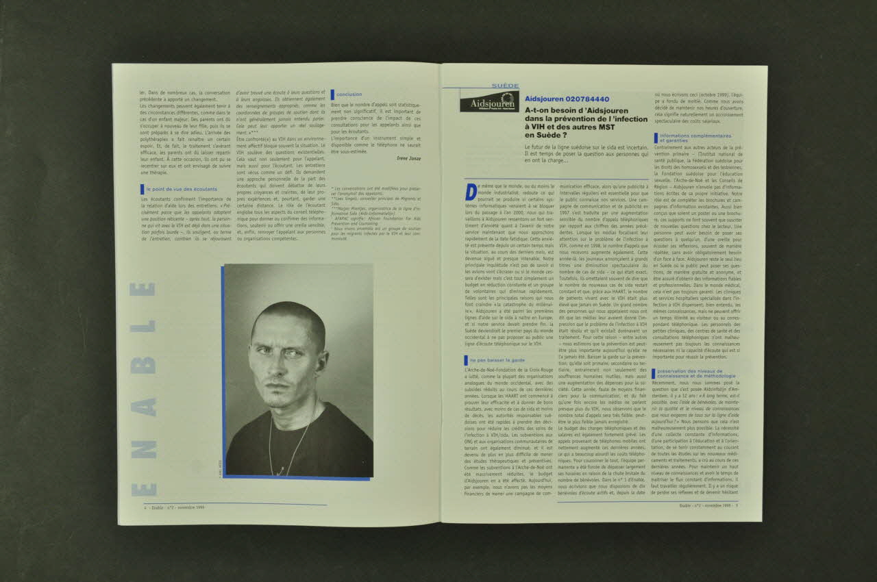 sommaire // // Pays-Bas // Aidsinfolijn // Petits nombres, grands problèmes [...] 3 // // Suède // Aidsjouren // A-t-on besoin d'Aidsjouren dans la // prévention de l'infection à VIH en Suède? [...] 5 // // Allemagne // Berliner Aids Hilfe // Prophylaxie après exposition au VIH // en dehors du cadre professionnel [...] 7 // // Espagne // FASE // Sida et immigration en Catalogne [...] 8 // // France // Sida Info Service // Vécus individuels et perceptions // du risque chez certains gays [...] 11 // // Italie // Il Telefono Verde // La ligne d'écoute sur le sida // (numéro vert) et les populations migrantes [...] 13 // // Les oreilles n'ont pas de paupières // Grégory Maréchal [...] 15 // // ENAH // La charte [...] 16 (Au recto et au verso, même page de couverture en français et anglais, dans un sens de lecture ou dans l'autre.), rectoDécor