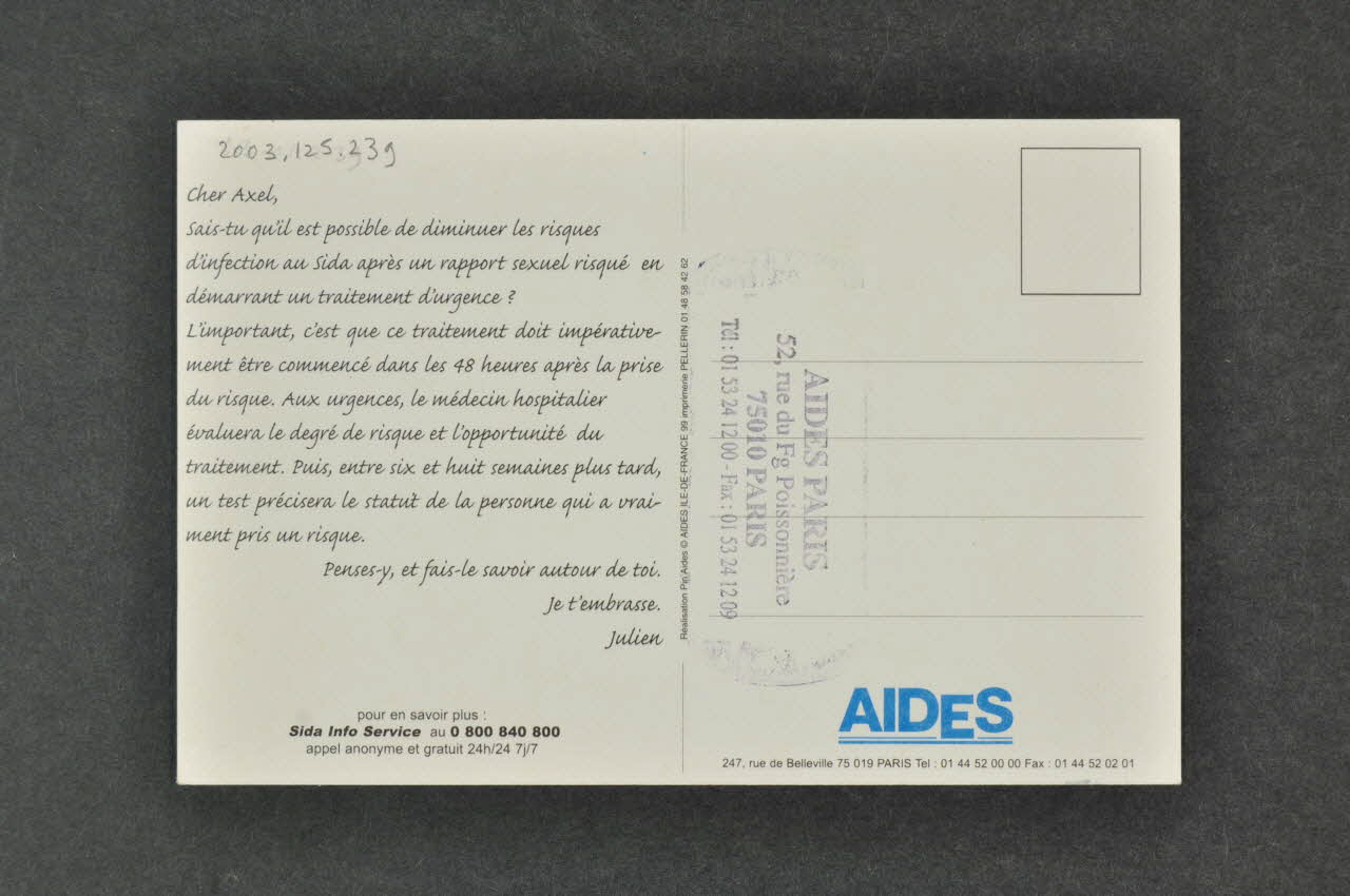 "Cher Axel, // Sais-tu qu'il est possible de diminuer les risques d'infection au sida après un rapport sexuel risqué en démarrant un traitement d'urgence? // L'important, c'est que ce traitement doit impérativement être commencé dans les 48 heures après la prise du risque. Aux urgences, le médecin hospitalier évaluera le degré de risque et l'opportunité du traitement. Puis, entre six et huit semaines plus tard, un test précisera le statut de la personne qui a vraiment pris un risque. // Penses-y et fais-le savoir autour de toi. // Je t'embrasse. // Julien, versoDécor