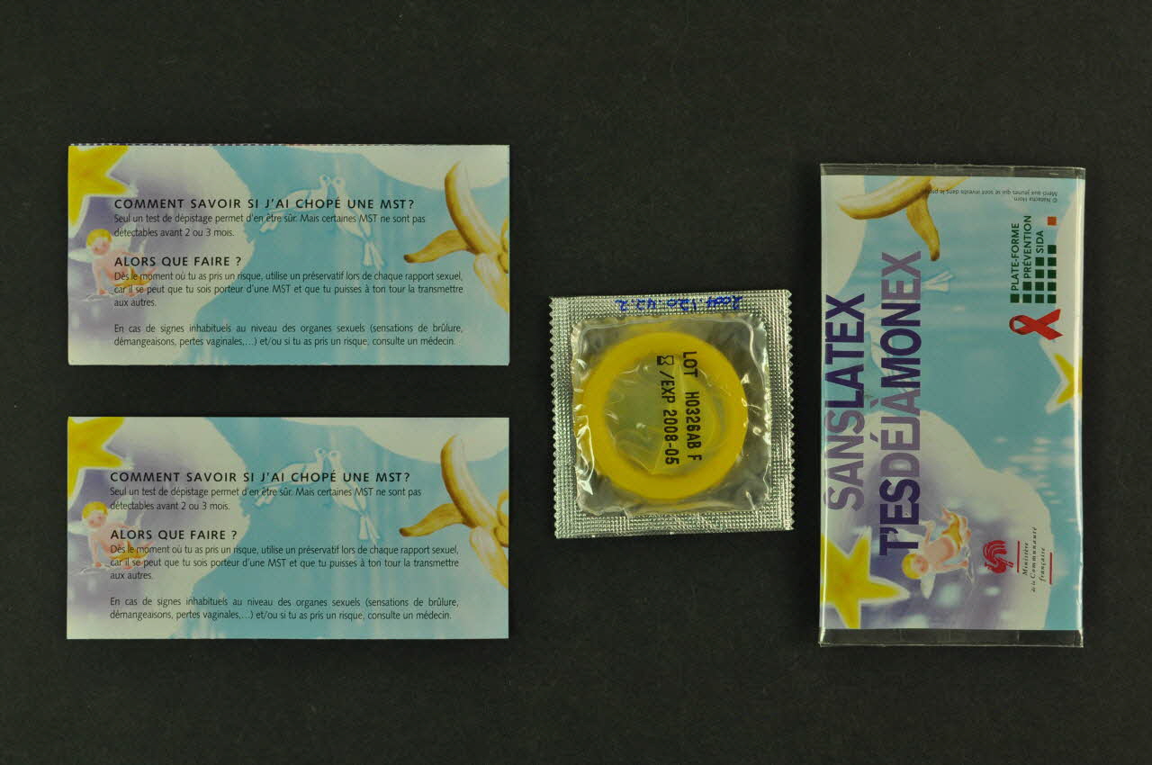 Le papier sur fond violet est un dépliant avec plusières inscriptions sur les deux faces. La couverture présente sur le fond des dessins d'étoiles jaunes et angelots sur fond bleu ainsi qu'un dessin violet en forme de préservatif, avec une inscription en blanc. Le dos de couverture présente des inscriptions en capitales violet, en haut. Il a le même fond avec des étoiles et un angelot ainsi qu'une banane. En bas à gauche il y a un ruban rouge, à côté des petits carrés verts, et à droite du cela des inscriptions en vert. Au fond à droite on trouve un logo en forme de coq en rouge, avec des inscriptions en bas.Inscriptions