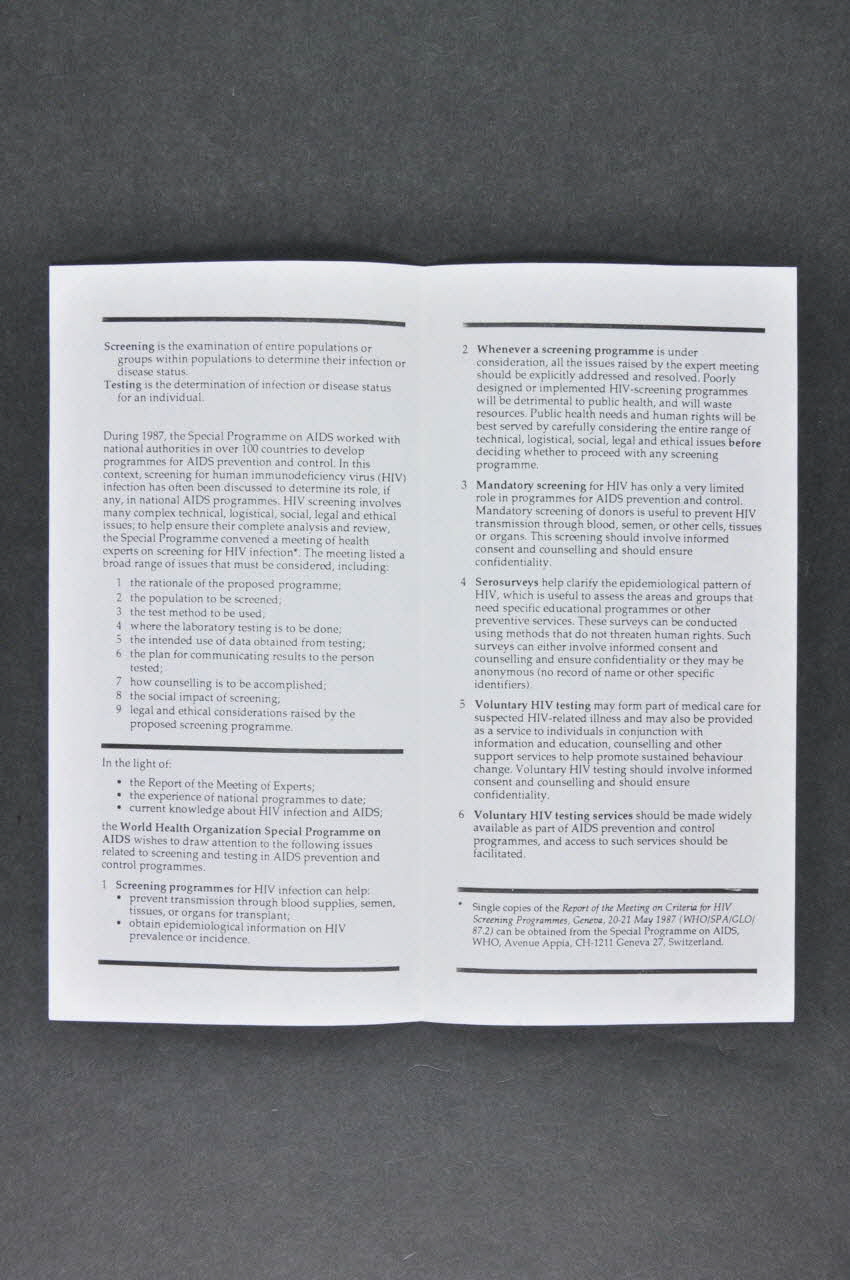 Dépliant, "Screening and testing in AIDS prevention and control programmes" (Dépistage et examens à pratiquer dans le cadre des programmes de lutte contre le SIDA)