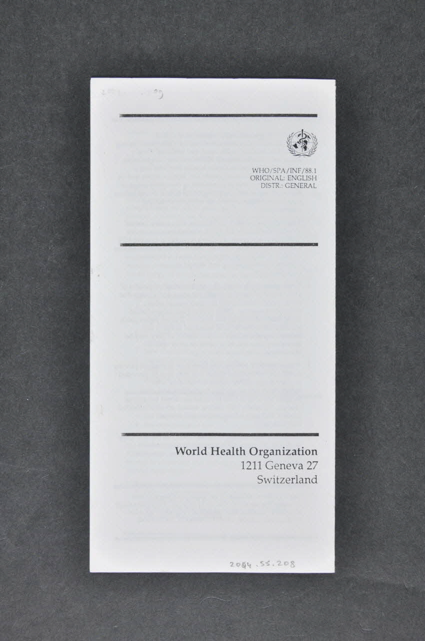 World Health Organization // 1211 Geneva 27 // Switzerland (Sur la face postérieure, en partie inférieure.), versoLogo, date, nom d'association
