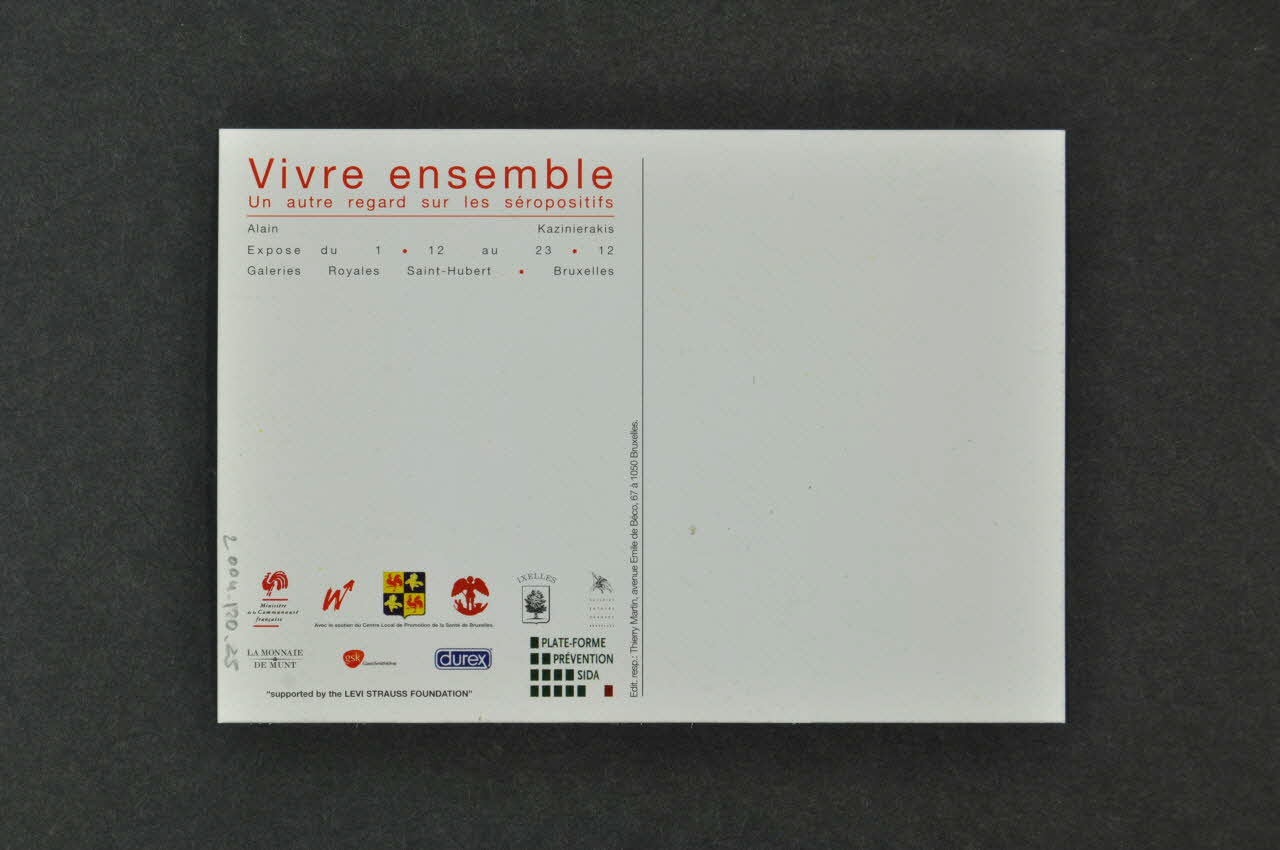 Vivre ensemble // Un autre regard sur les séropositifs // // Alain Kazinierakis // Expose du 1/12 au 23/12 // Galeries Royales Saint-Hubert/Bruxelles (Texte imprimé en rouge et noir dans la partie supérieure gauche.), versoDécor