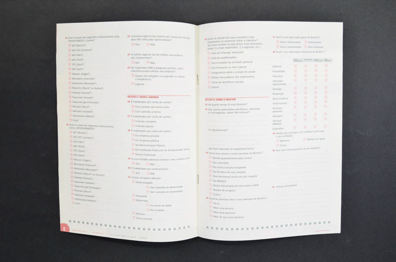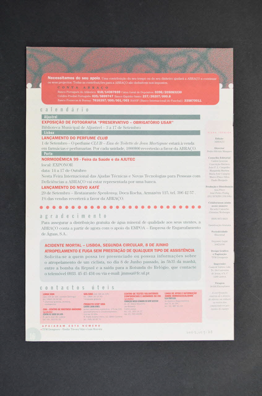 bimestriel / Tirage à 18.000 exemplaires / p. 1-2 - Editorial : Les arbitraires de la commission que ne lutte pas contre le sida (absence de politique de santé publique au Portugal ; retard ou absence de subventions, réduction du tirage et nombre de pages du bulletin) p. 2 Le programme d'Abraço de prévention pour les jeunes sélectionné comme "bonne pratique" par ONUSIDA. p. 2 Décision d'organiser des conférences d'information et discussion autour du bulletin p. 3 Annonce de la 7° conférence européenne sur les aspects cliniques et le traitement p. 3 Approbation en Europe du fomivirsen (Vitraven) contre le CMV p. 3 Le gouvernement sud africain promeut la distribution de préservatifs féminins p. 4 Maria Jose Campos : essai Prometheus (pour les utilisateurs de drogues) p. 5-8 Hépatite C p. 8 témoignage : je ne sais jamais quoi manger (traduction de Remaides) - Encart questionnaire pour mieux connaître les lecteurs (questionnaire de 4 pages : état civil , statut sérologique, hémophilie, usage de drogues, orientation sexuelle, niveau de scolarité / année dépistage, charge virale, CD4, traitement, infections opportunistes, effets secondaires / situation professionnelle..., raisons de ne pas trouver de travail / avis sur le bulletin p. 9 Nouvelles perspectives sur la lipodistrophie p. 10-11 Santé mentale (dépression, anxiété...) (article traduit de NAM) p.11 Lettre de lecteur : protestation contre le commission éthique de l'Hôpitél Santa Maria refusant l'entrée d'un malade dans un protocole de compassion p. 12 Encore une fois : combien sommes nous (critique des données épidémiologiques nationales trop sous estimées) p. 13 Témoignage d'un détenu p. 14 petites annonces p. 15 Recette p. 15 Glossaire p. 16 Calendrier
