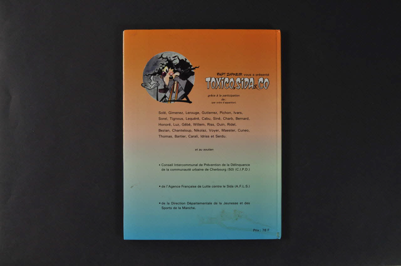 BD. Couverture avec illustration signée "Solé 93" représentant un homme jouant du bilboquet avec une seringue recouverte d'un préservatif, un image grimaçante d'un virus faisant office de boule. Titre en partie supérieure : "Rappi zappeur présente : Toxico, sida & Co". Sur le côté gauche de la couverture, colonne des noms des artistes ayant participé à la bande dessinée.