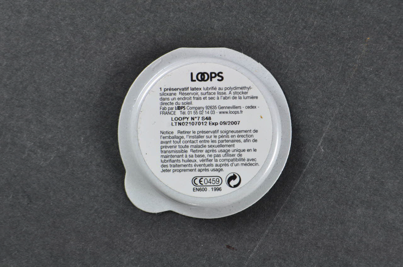 Au dos se trouve le nom de la marque et un mode d'emploi. Un préservatif est rangé à l'intérieur.Inscriptions