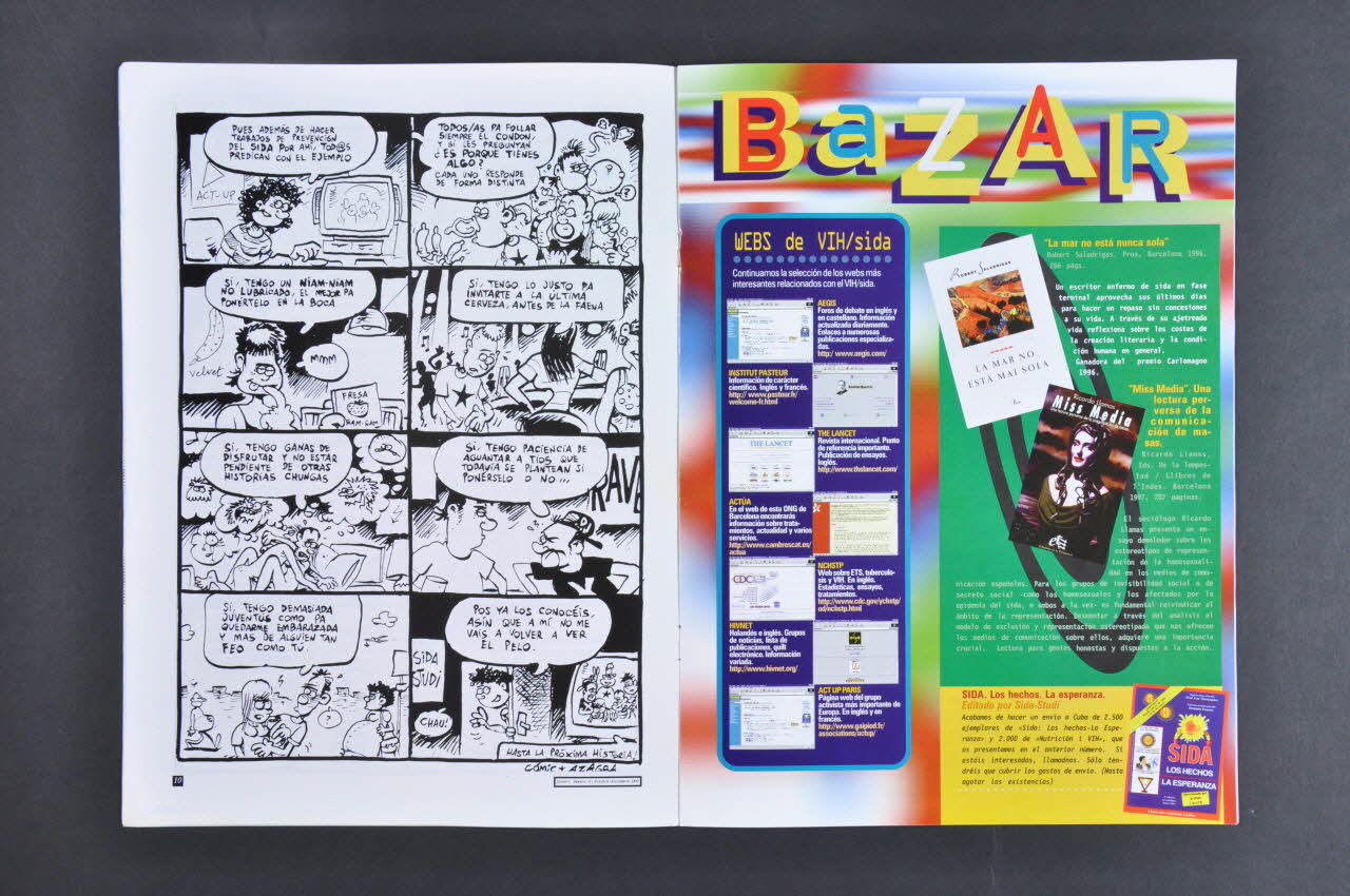 A fondo // Gays // y prevención // // Entrevista // Jordi Casabona, // director del // CEESCAT // 6 // // 12 // Reportaje // Médicos sin // Fronteras: // Africa // // Opinión // El activismo en // tratamientos // 16 // // 18 // Salud // A ciegas // // 20 // Tratamientos // Citomeglovirus // // 22 // Aula // Si quieres // vencer a tu // enemigo // conócelo (En haut de la page 2, titres alignés sur un bandeau horizontal, accompagnés de photographies noir et blanc), à l'intérieurTitre