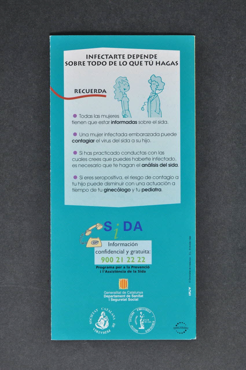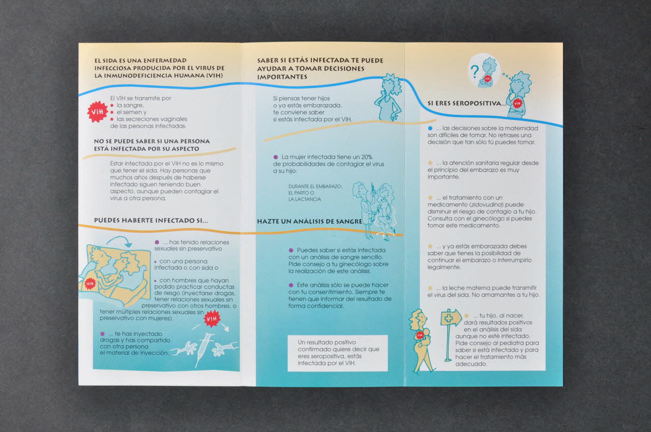 ?QUE HAY QUE // TENER EN CUENTA? (En partie médiane en noir.), sur la couvertureEL SIDA ES UNA ENFERMEDAD // INFECCIOSA PRODUCIDA POR EL VIRUS DE // LA INMUNIDEFICIENCIA HUMANA (VIH) // // NO SE PUDE SABER SI UNA PERSONA // ESTA INFECTADA POR SU ASPECTO // // PUEDES HABERTE INFECTADO SI // // SABER SI ESTAS INFECTADA TE PUEDE // AYUDAR A TOMAR DECISIONES // IMPORTANTES // // HAZTE UN ANALISIS DE SANGRE // // SI ERES SEROPOSITIVA // // ?COMO PUEDES PROTEGERTE DEL SIDA? (Sous-titres en gras sur les quatre volets intérieurs.), à l'intérieurTexte