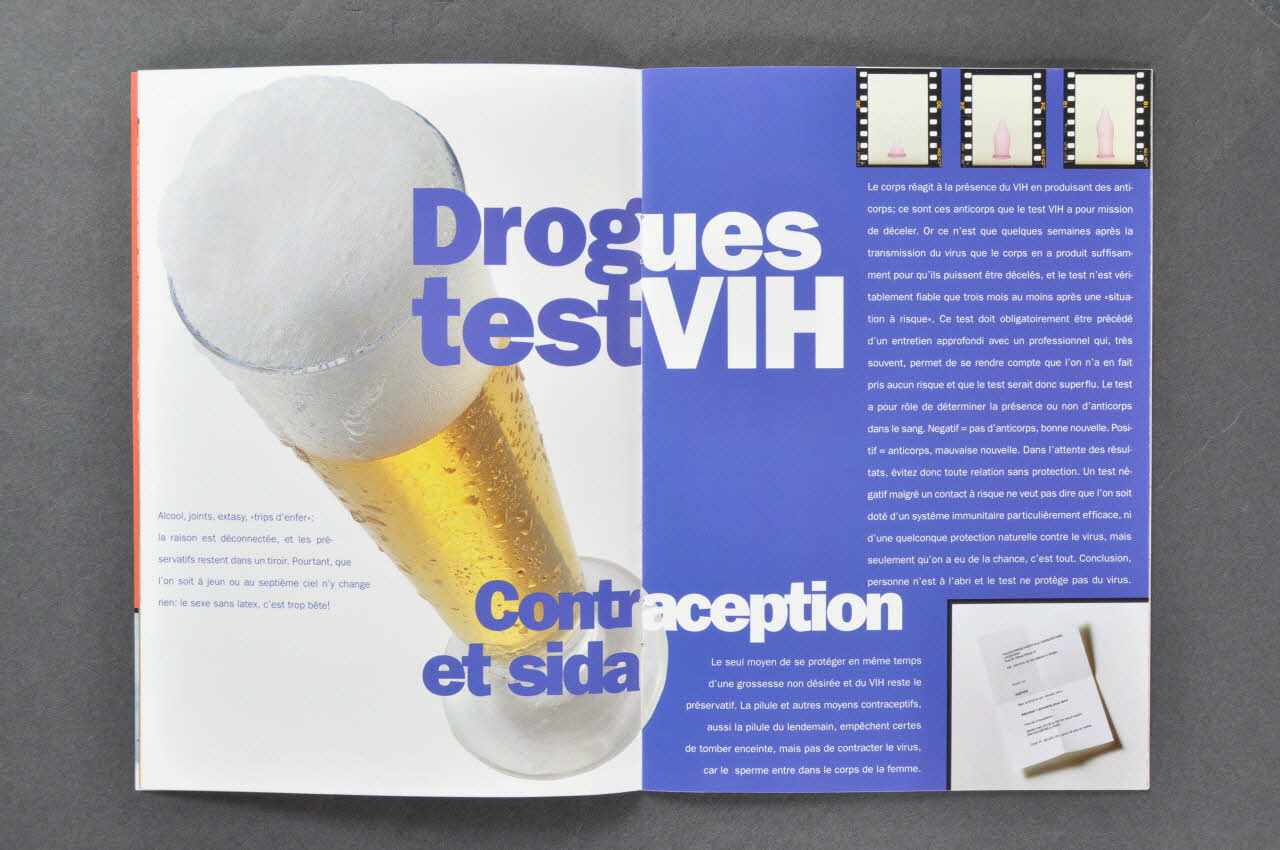 - p.3-4 A gauche en fond, grande photo noir et blanc de deux têtes : une femme blonde embrassant un homme brun. Aucune impression sinon les débuts des titres de paragraphes. A droite, fond noir, impression en blanc. En haut, à droite, petite vignette noir et blanc avec les mêmes personnages, l'homme enlaçant la femme et tenant un préservatif. Titres à cheval sur les deux pages.