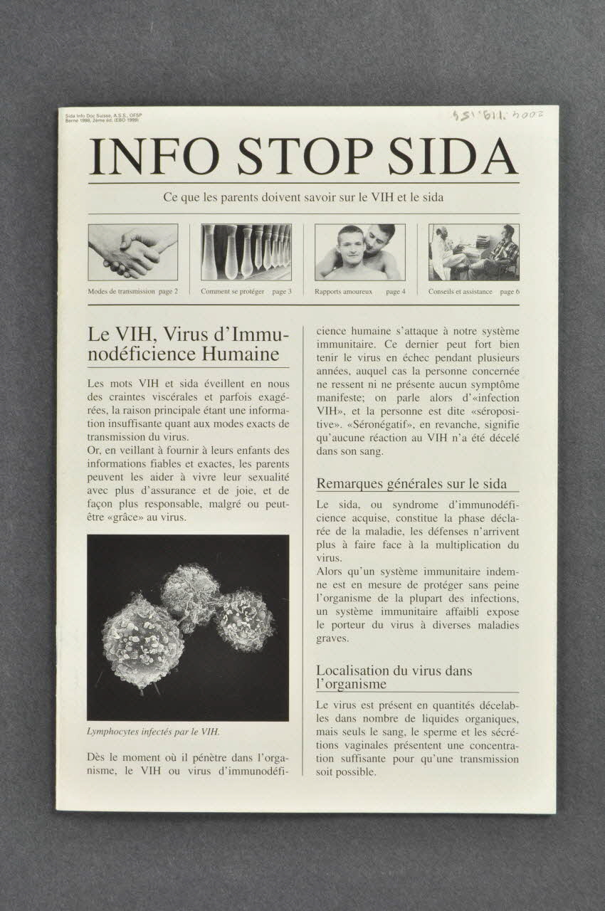 - p.3 : Comment le virus se transmet : Les risques de transmission / Moyens de protection (photos : couple masculin / test d'étanchéité de préservatifs / photo d'une affiche de la campagne Stop sida avec préservatif)
