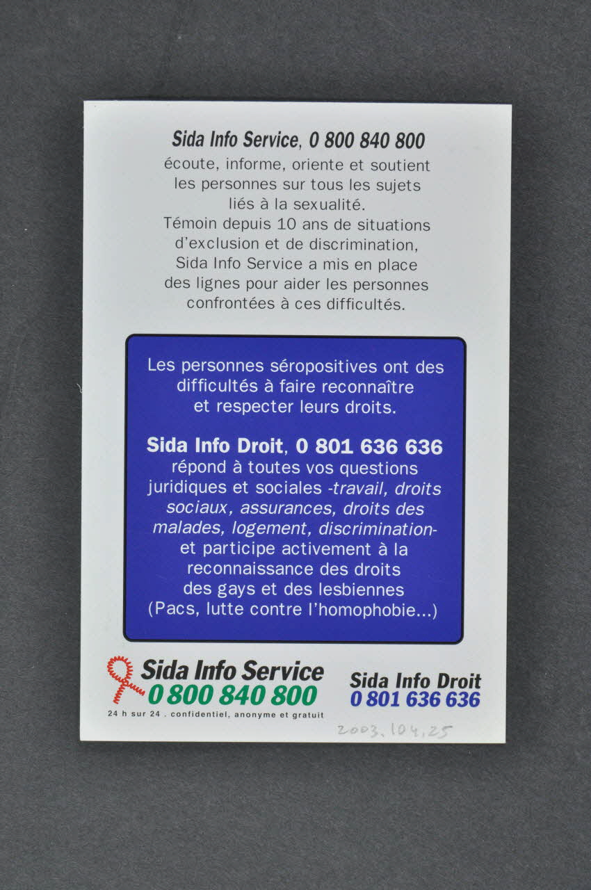 Sida Info Service, 0 800 840 800 / écoute, informe, oriente et soutient / les personnes sur tous les sujets / liés à la sexualité. / Témoin depuis 10 ans de situations / d'exclusion et de discrimination, / Sida Info Service a mis en place / des lignes pour aider les personnes / confrontées à ces difficultés. (Petit texte imprimé en noir, au dos de la carte, en haut, au dessus d'un cadre bleu.), versoCUNEO (Signature du dessin placé sous ce dernier, en bas, à droite.), rectoSida Info Service / 0 800 840 800 / 24 h sur 24 . confidentiel, anonyme et gratuit (Numéro de téléphonne inscrit dans le bas du dos de la carte, à gauche. Il est imprimé en vert, en dessous du nom du service qui est inscrit en noir, à droite d'un logo rouge représentant le "ruban rouge" en fil téléphonique.), versoDécor