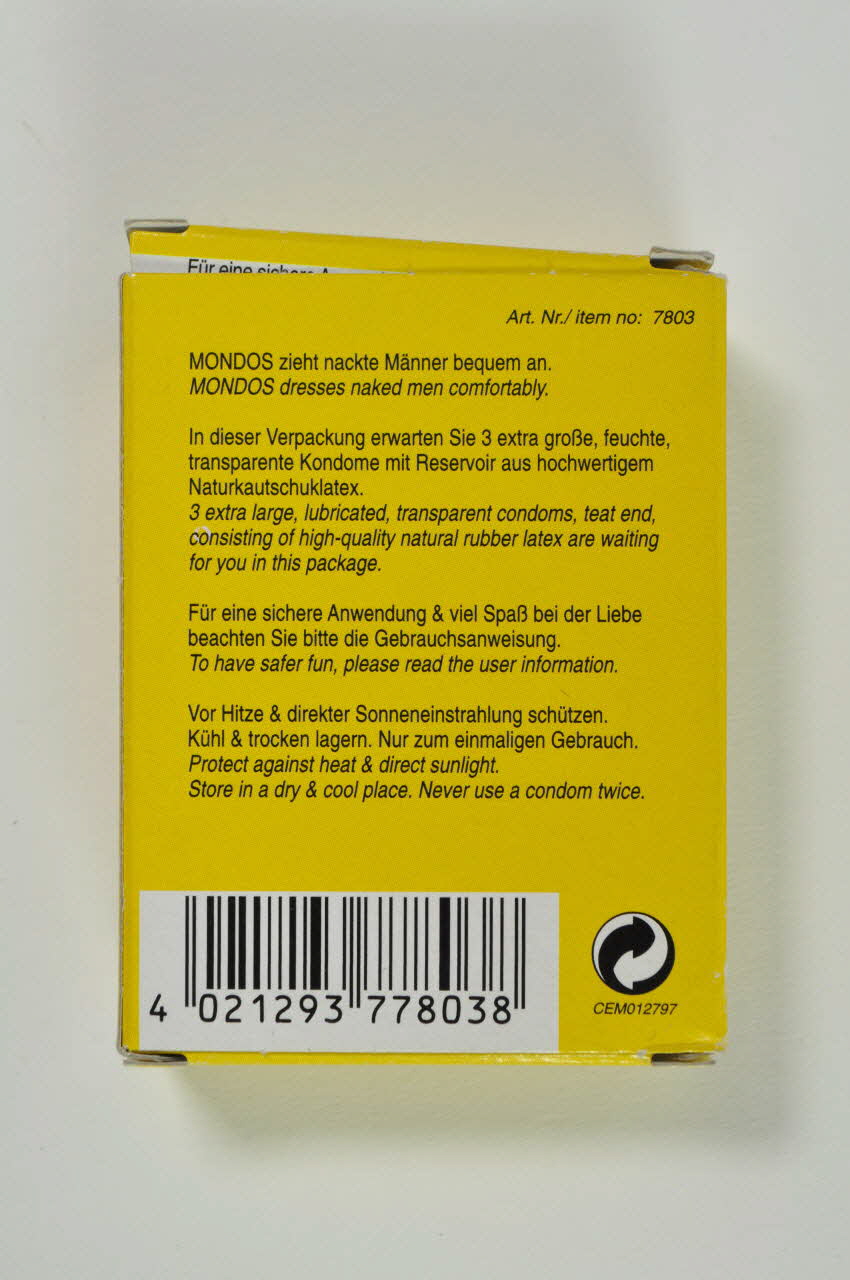 L'étui a la forme d'une boîte rectangulaire verticale, de couleur jaune. Destinée à contenir trois préservatifs, elle est aujourd'hui vide. Sur la face principale, une mappemonde aplatie grise est représentée en haut. En-dessous, en caractères gris et noirs, sont indiqués le nombre de préservatifs contenus à l'intérieur, ainsi que leur taille. Sur le reste de la boîte, une écriture en caractères noirs indique les précautions de conservation au dos, la typologie des préservatifs, les coordonnées du distributeur et la date limite d'utilisation sur les faces latérales.Inscriptions