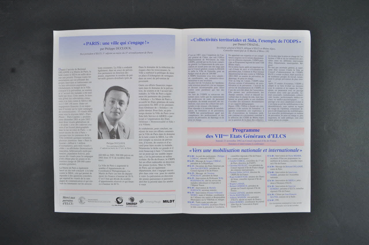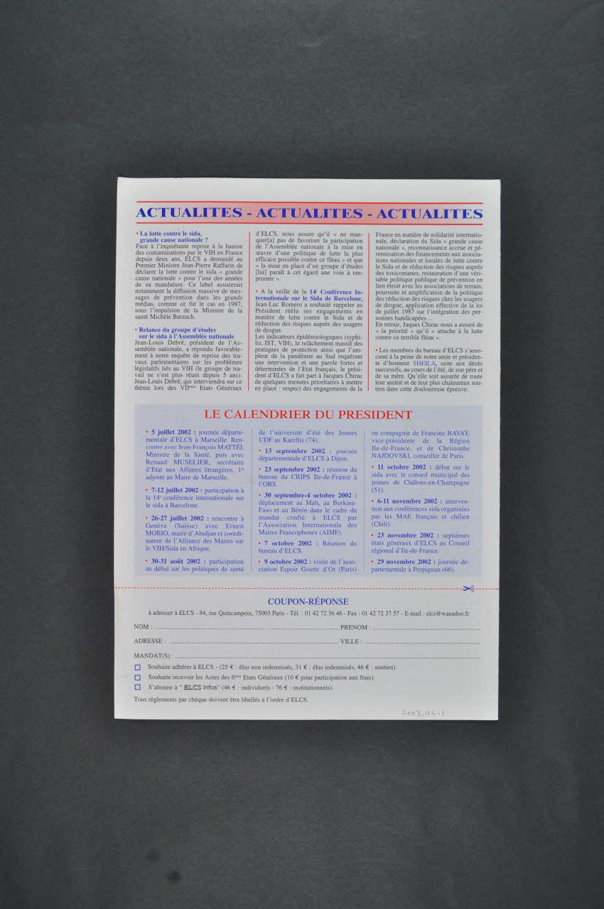 Le bulletin d'information associatif se présente sous la forme d'une brochure de deux pages. Il s'agit du dixième numéro édité. Le titre est inscrit en haut du recto, en lettres bleues, blanches et rouges sur un fond gris, à droite d'un ruban rouge tricolore. Dessous, en lettres noires et bleues, sur un fond en dégradé bleu, se développe l'éditorial du coordinateur de l'Alliance des Maires et Responsables municipaux sur le VIH/Sida en Afrique. Il est réparti sur trois colonnes, autour de la photographie en noir et blanc de l'éditorialiste. Dans la partie inférieure, en lettres noires sur un un rectangle bleu, est indiqué le sommaire du bulletin. L'organisation se fait comme suit: page 1, une intervention de Philippe Ducloux, Vice président d'ELCS, 1er adjoint au maire du 11° arrondissement de Paris : "Paris, une ville qui s'engage" (lutte contre le sida à Paris depuis l'arrivée de Delanoë); page 2, article de Daniel Chazal, "Collectivités territoriales et Sida, l'exemple de l'office Déparytemental de Prévention du sida de l'Isère"; et le Programme des VII° Etats Généraux d'ELCS : "Vers une mobilisation nationale et internationale"; au verso, les actualités et "Le calendrier du Président". Dessous est inscrit un coupon d'adhésion prédécoupé.