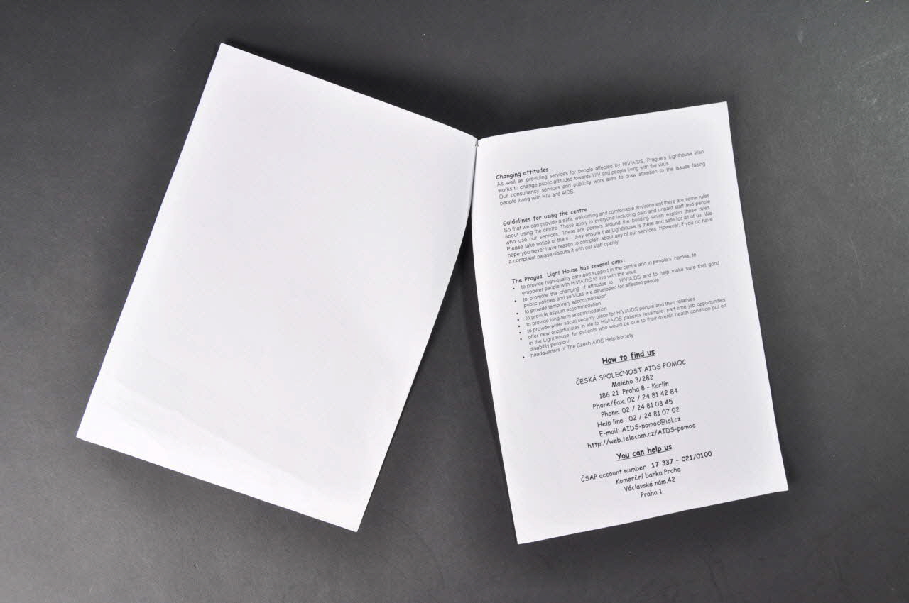 prospectus, "Welcome to Prague Lighthouse. A centre for people facing the challenge of HIV/AIDS" (Bienvenue à la Lighthouse de Prague. Un centre pour les personnes faisant face au combat contre le VIH/Sida)