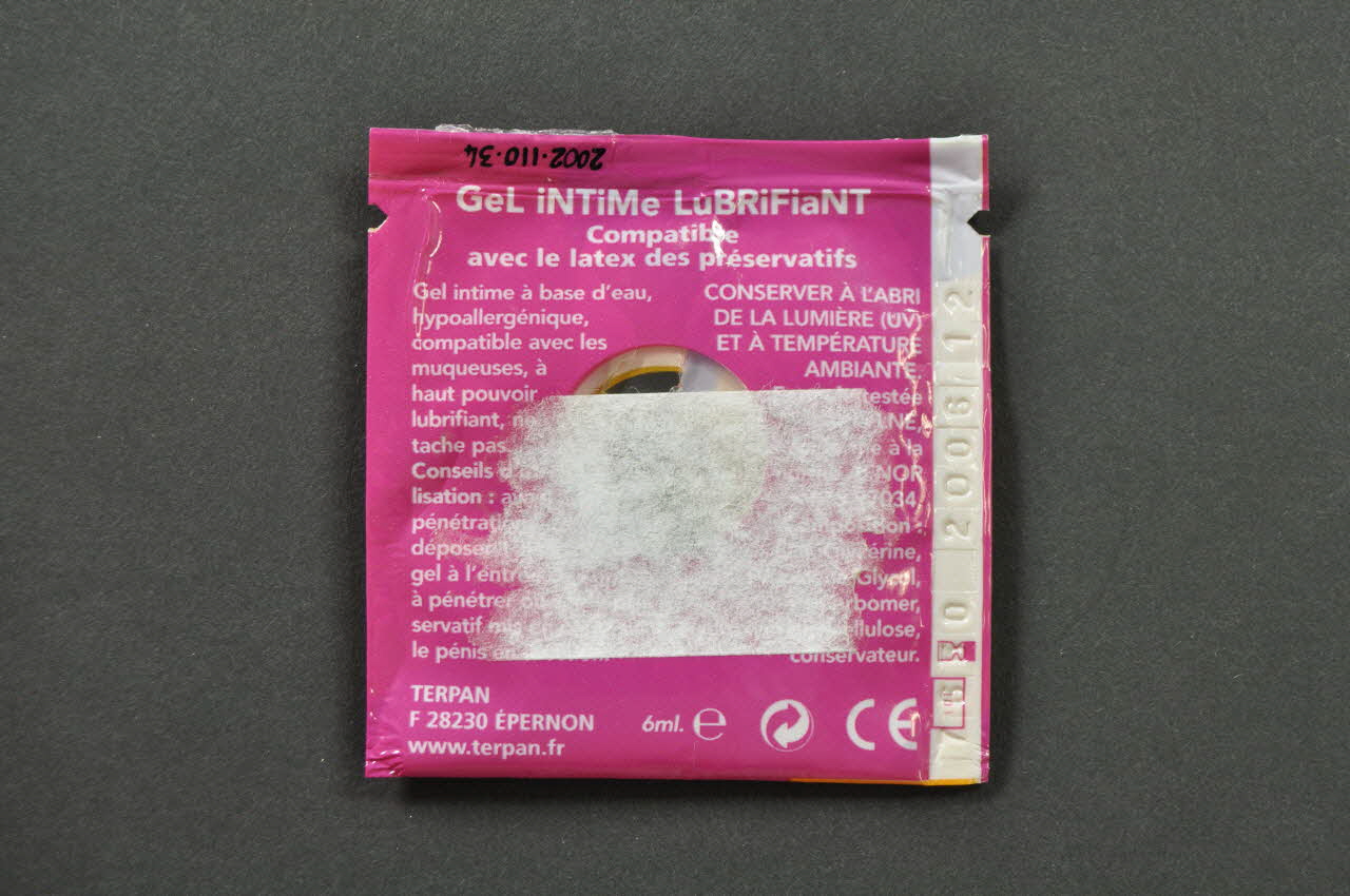 GeL iNTiMe LuBRiFiaNT // Compatible // avec le latex des préservatifs // // Gel intime à base d'eau, hypoallergénique, compatible avec les muqueuses, à haut pouvoir lubrifiant, ne tache pas. // Conseils d'utilisation : avant pénétration, déposer 1 dose de gel à l'entrée de l'orifice à pénétrer ou sur le préservatif mis en place sur le pénis en érection. // CONSERVER A L'ABRI DE LA LUMIERE (UV) ET A TEMPERATURE AMBIANTE. // Formule testée par le LNE, conforme à la norme AFNOR // Composition : eau, glycérine, propylène Glycol, Carbomer, Hydroxyméthylcellulose, conservateur. // // TERPAN // F28230 EPERNON // www.terpan.fr // // 6ml., versoGeL LuBRiFiaNT (Inscriptions en spirale), rectoDécor
