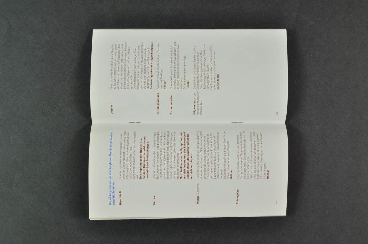 Was ist Aids? 5 // Die HIV-Inferktion 7 // [...] // Übertragung 10 // [...] // Informationen zur Epidemie 16 // Schutz: Safer Sex und Safer Use 19 // [...] // Der HIV-Test 31 // [...] // Welche medizinschen Behandlungsmöglichkeiten gibt es ? 39 // HIV / Aids und die Gesellschaft 43 // [...] // Beratung und Unterstützung 48 // [...] // Index 54 (page 1 en haut), à l'intérieurDécor