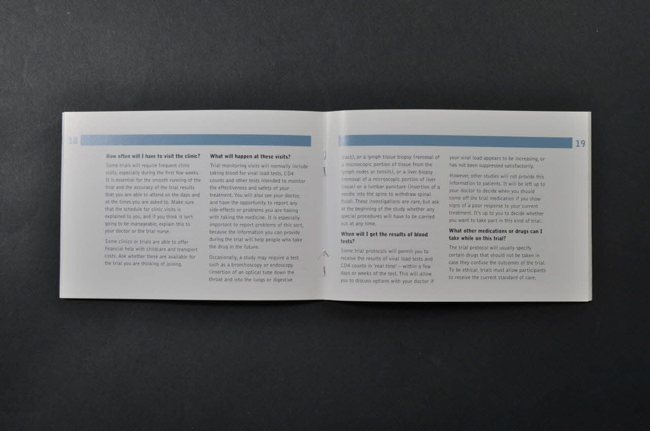 information series for hiv-positive people (inscription en gris sur fond bleu clair dans la bande verticale en haut de la couverture, au-dessus du titre), sur la couvertureDécor