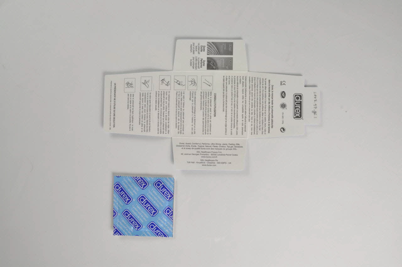 Préservatif en latex contenu dans une enveloppe carrée en plastique bleu, sur laquelle sont imprimés des inscriptions bleues formant le logo, et des inscriptions blanches. Le revers, argenté, porte des inscriptions noires.
