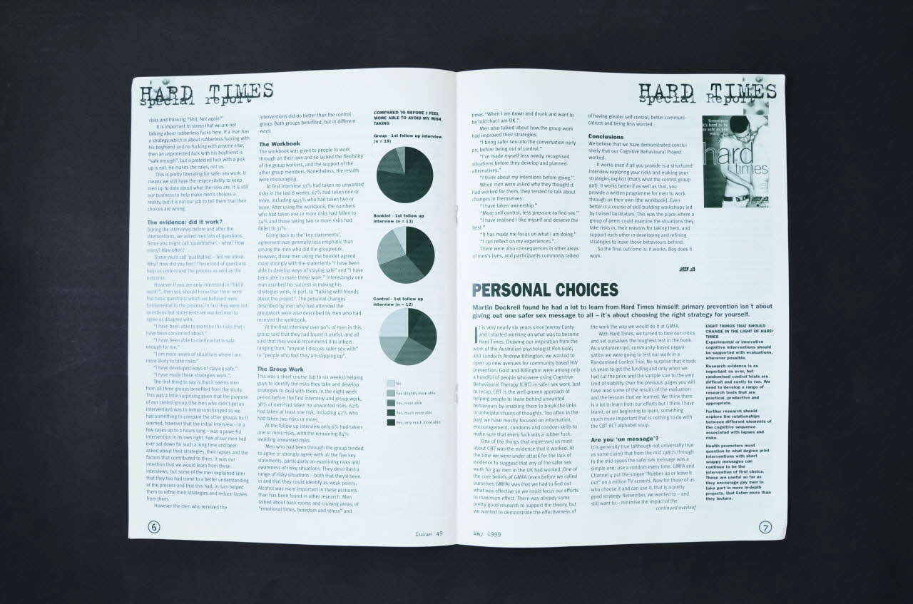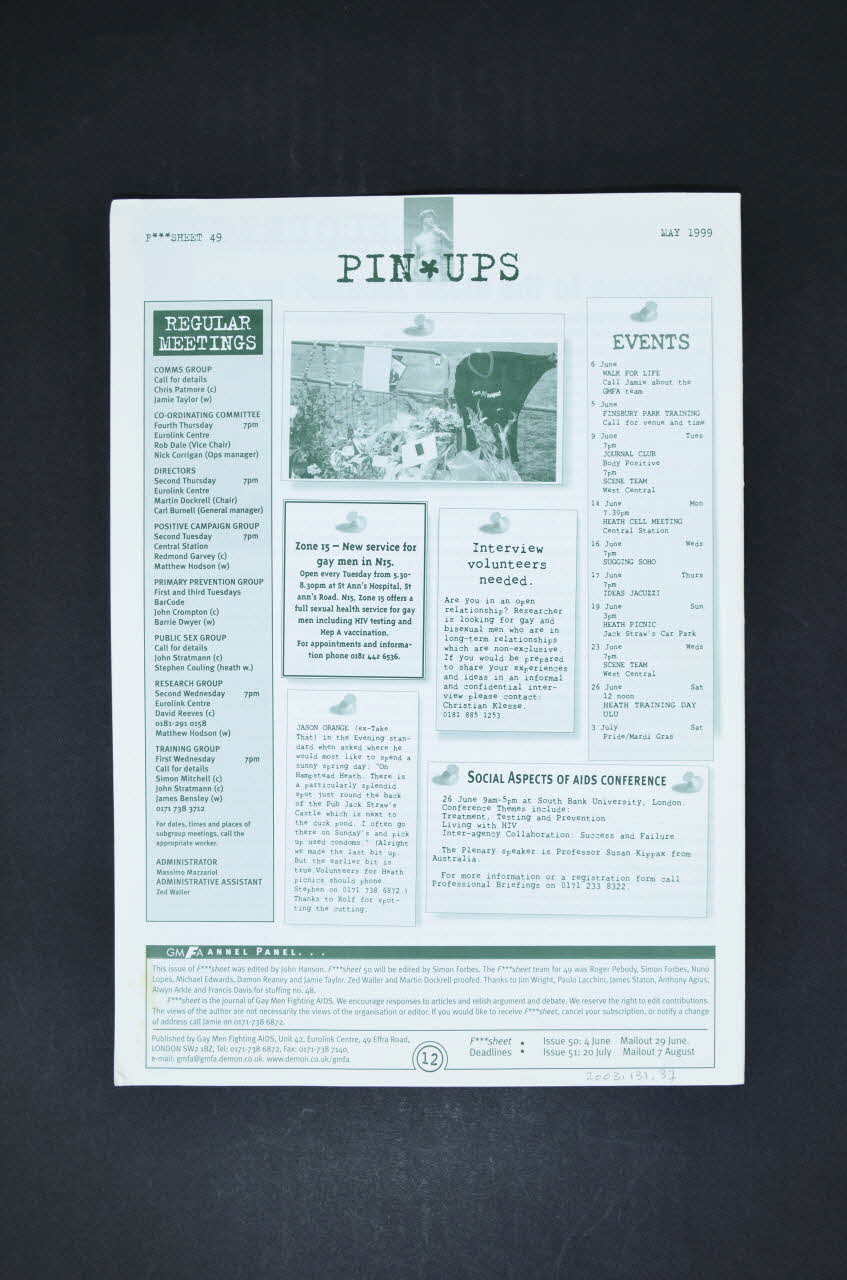 Résumé: "It cost too much to keep you negative" (Cela coûte trop cher de vous conserver séronégatif) : un homme gay trouve qu'il doit mentir pour accéder au traitement post exposition - présentation de volontaires - informations sur les groupes de l'association (safer sex group) - viol et violence -- nouvelles de l'association - la campagne "love and respect" sur l'estime de soi (Présentation d'un plan d'enquête dans trois groupes "chauds" et des problèmes rencontrés) - vote pour le statut de "charity" de l'association (signification de ce statut) - bilan du "hard time project'" de l'association (projet de réduction des risques : moindre risque, stratégies...) - Question de la censure de scènes de pénétration explicite gays dans une vidéo de safer sex produite par l'association. (scènes de pose de préservatif sur pénis en érection) -témoignage d'un collecteur de fonds (à vélo entre Londres et Edinburgh) - nouvelles de l'association et de ses groupes