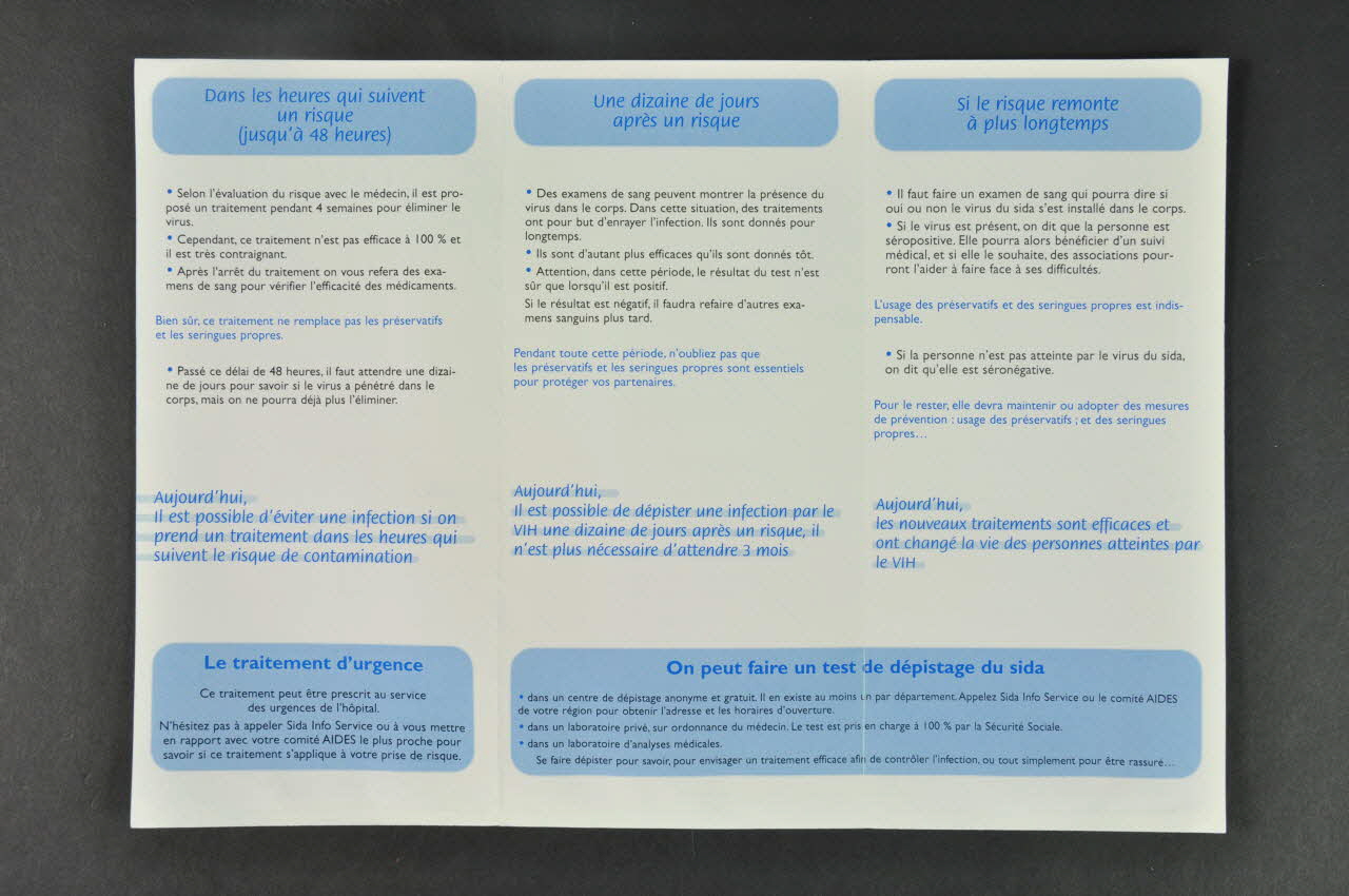 Résumé. "Le "test de dépistage du sida" se fait par une prise de sang. Il permet de savoir si l'on est ou non atteint par le virus VIH (virus du sida)" "ceci est important pour agir en cas d'atteinte par le virus VIH / parce que maintenant des médicaments peuvent contrôler l'infection par le virus / parce que les médicaments sont d'autant plus efficaces s'ils sont pris tôt après la pénétration du virus dans le corps. Ceci est aussi important si on n'est pas atteint, pour renforcer les pratiques de prévention : usage de préservatif et de matériel d'injection propre et stérile. Feuillet 1 : En haut : "Dans les heures qui suivent un risque (jusqu'à 48 heures)" En bas :"Aujourd'hui , il est possible d'éviter une infection si on prend un traitement dans les heures qui suivent le risque de contamination." En dessous : "Le traitement d'urgence" (service d'urgence de l'hôpital, Sida Info Service, Comité AIDES). Au centre du feuillet, en noir, explications sur le traitement d'urgence. Feuillet 2 : En haut :"Une dizaine de jours après le risque". En bas : "Aujourd'hui, il est possible de dépister une infection par le VIH une dizaine de jours après un risque, il n'est plus nécessaire d'attendre 3 mois." En dessous, à cheval sur les feuillets 2 et 3 : "On peut faire un test de dépistage du sida" (lieux où le test peit être fait) Au centre du feuillet, en noir, explications . Feuillet 3 : En haut : "Si le risque remonte à plus longtemps". En bas : "Aujourd'hui, les nouveaux traitements sont efficaces et ont changé la vie des personnes atteintes par le VIH." Au centre du feuillet, en noir, explications. Feuillet 4 : En haut :"Le virus du sida se transmet : par relations sexuelles, lors du partage de seringue, pendant la grossesse, d'une mère infectée à l'enfant / En bas : "Si vous pensez avoir pris un risque, l'important c'est d'en parler. (Sida Info Service ou AIDES). Au centre :"Quelques bonnes raisons pour faire un test ou pour prendre un conseil...(texte en noir avec extraits de témoignage) Feuillet 5 : " En 1998, des choses ont changé. / A tout moment, dès qu'un doute s'installe, il y a quelque chose à faire pour savoir si oui ou non on est infecté par le VIH" / En 1988, d'autres choses n'ont pas changé : le test de dépistage du sida ne peut être pratiqué sans votre consentement ... / Le dépistage, c'est aussi préserver sa santé"