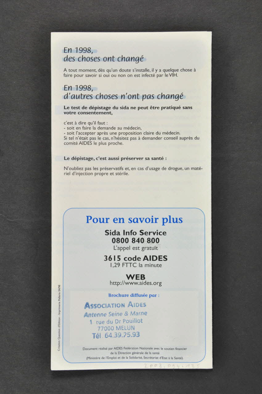 Pour en savoir plus // Sida Info Service // 0800 840 800 // L'appel est gratuit // // 3615 code AIDES // 1,29 FTTC la minute // // WEB // http://www.aides.org // // Brochure diffusée par: // ASSOCIATION AIDES // Antenne de Seine&Marne // 1 rue du Dr Pouillot // 77000 MELUN // Tél. 64.39.75.93 // // [...] (En bleu et noir dans un cadre bleu, dans la partie inférieure), versoDécor