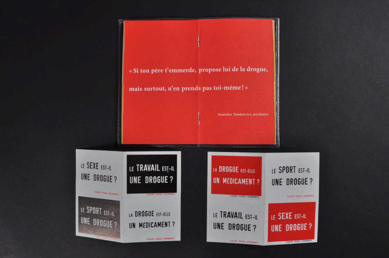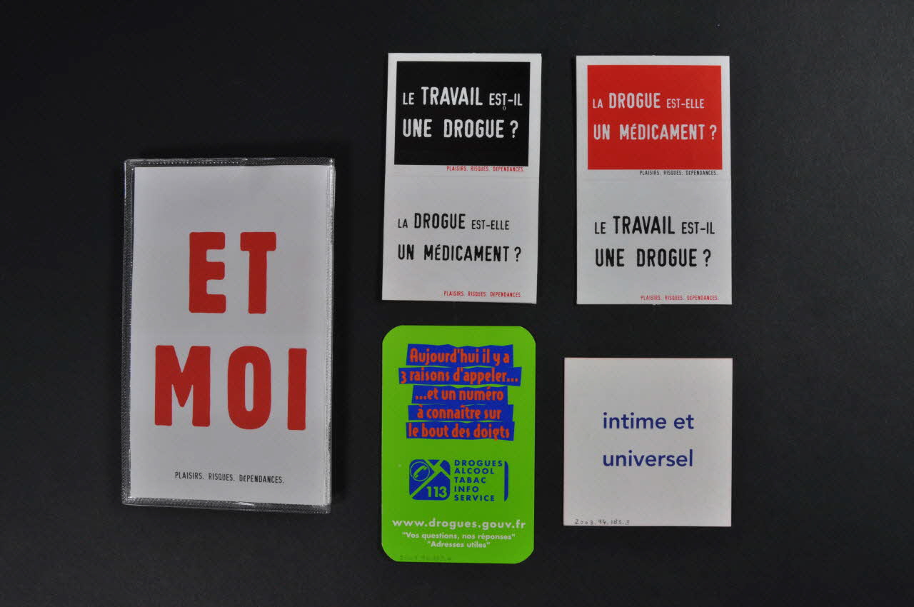 .4 : à l'intérieur des rabats de la couverture transparente, un carton rectangulaire, aux angles arrondis, présentant des inscriptions bleues et blanches sur fond vert ainsi que le dessin d'une main présentant les trois sujets de dépendance principales : drogues, alcool et tabac.
