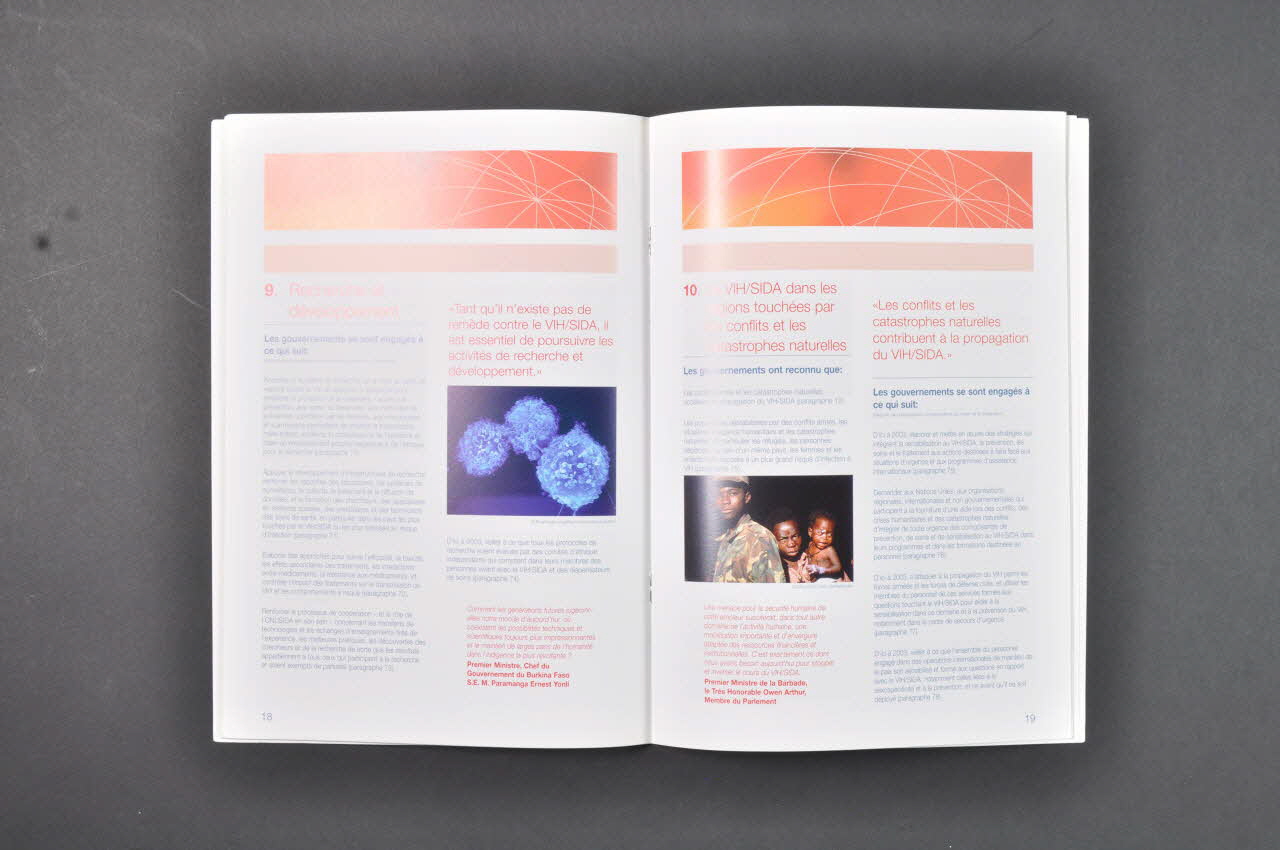 Table des matières // 1. Introduction // 2. Une implication au plus haut niveau // 3. Prévention // 4. Soins, appuis et traitement // 5. Le VIH/SIDA et les droits de l'homme // 6. Mieux protéger les personnes vulnérables // 7. Les enfants rendus aux orphelins et vulnérables par le VIH/SIDA // 8. Réduire l'impact social et économique // 9. Recherche et développement // 10. Le VIH/SIDA dans les régions touchées par les conflits et les catastrophes naturelles // 11. Ressources // 12. Suivi // Annexe 1. Texte intégral de la "Déclaration d'engagement sur le VIH/SIDA" (Page 3), à l'intérieurSous-titre