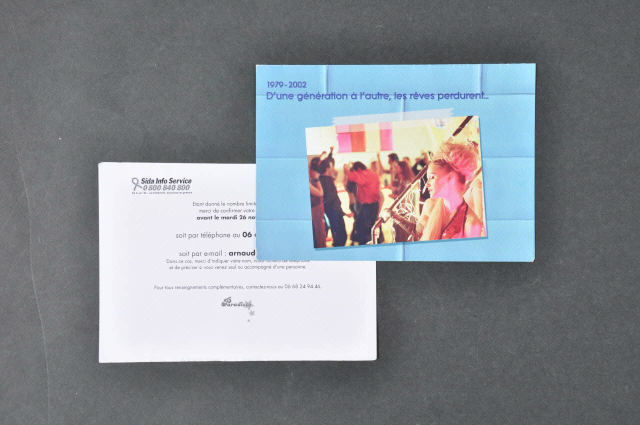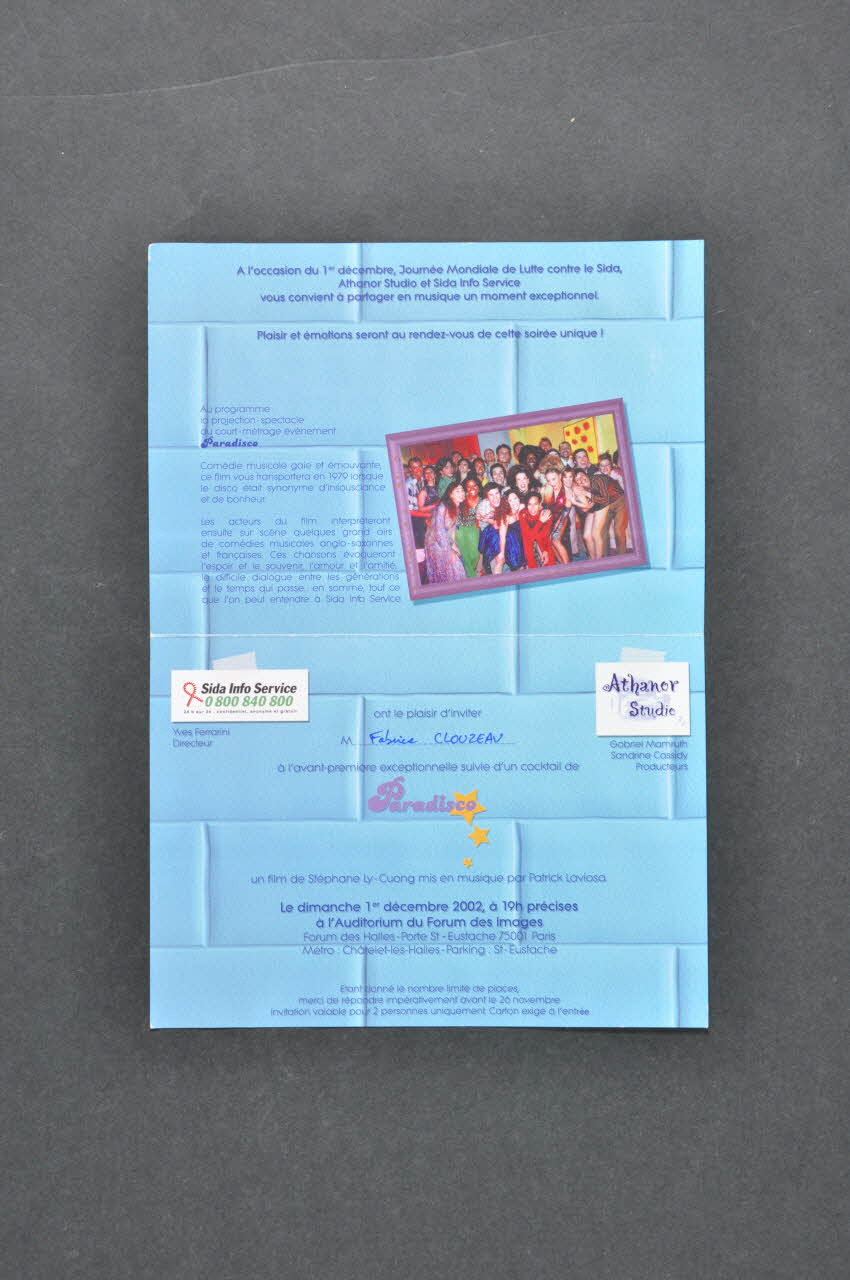 Le recto de .1 se compose au centre, un peu en biais, de la photographie couleur de jeunes dansant et avec une jeune femme blonde au premier plan. Dans la partie supérieure, un slogan est inscrit en caractères bleus. Le verso de .1 se compose au centre, un peu en biais, de la photographie couleur de jeunes dansant et avec au premier plan un couple de jeunes hommes enlaçés. Dans la partie supérieure, il y a le logo du court-métrage Paradisco et des informations le concernant en caractères bleus. Le site internet du film est mentionné en bleu au centre de la partie inférieure. L'auteur est mentionné en petits caractères blancs le long de la bordure droite. A l'intérieur de .1, on trouve le texte d'invitation et le programme en caractères bleus sur le volet un. A côté, il y la photographie couleur encadrée en violet d'un groupe de jeunes souriant et riant. Le second volet se compose dans sa partie supérieure des logos de Sida Info Service et de Athanor Studio. Le nom de l'invité a été inscrit manuscritement à l'encre bleue dans la zone à remplir. Le logo du film Paradisco se trouve au centre du volet en violet et jaune. Le lieu et la date de l'évènement sont mentionnés en caractères bleus dans la partie inférieure. Le feuillet mobile (.2) est seulement imprimé au recto en noir sur fond blanc. Dans la partie supérieure, il y a les logo de Sida Info Service et de Athanor Studio. Le texte au centre mentionne un numéro de téléphone et une adresse électronique.Inscriptions