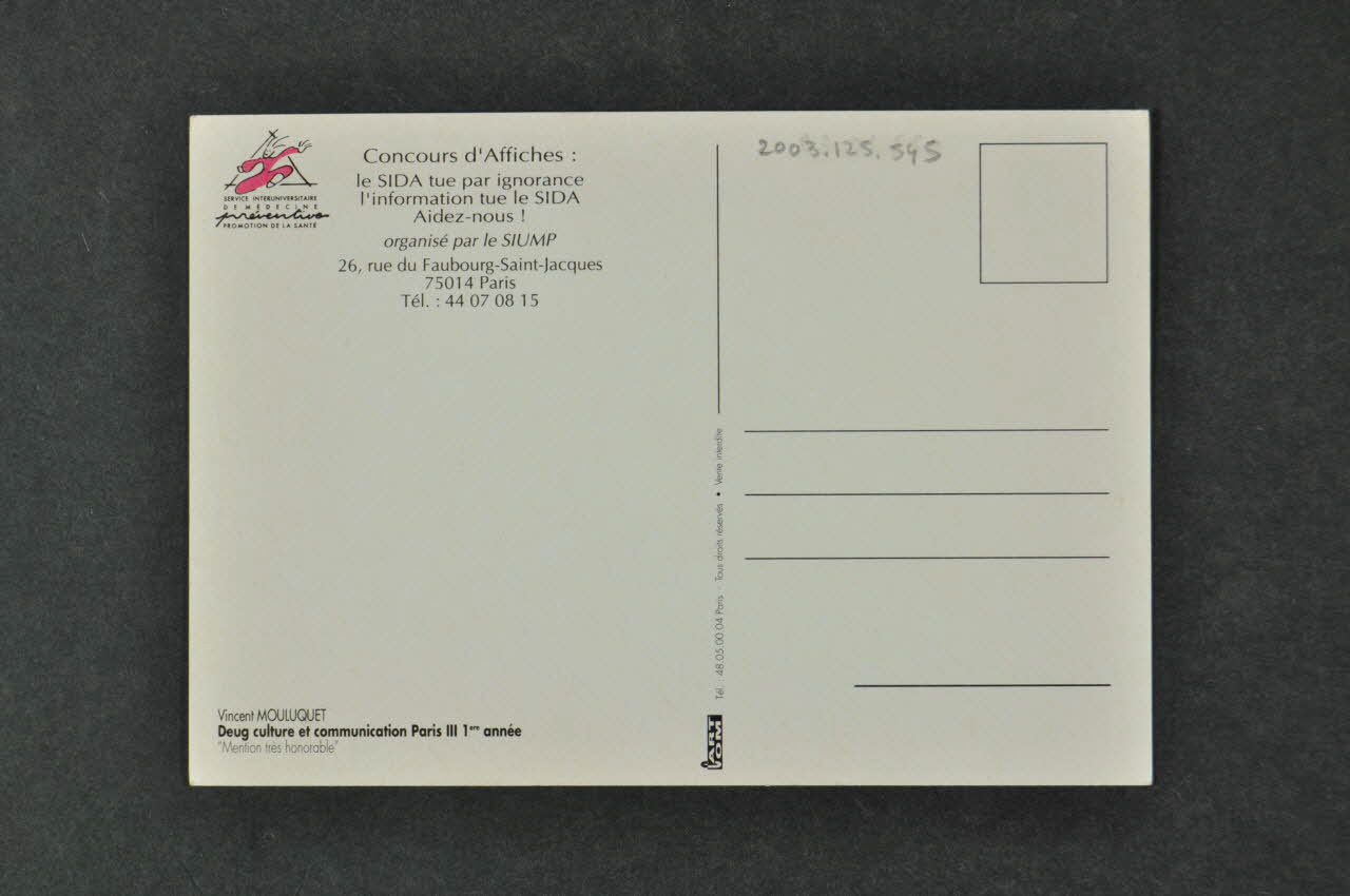Concours d'Affiches: // Le SIDA tue par ignorance, // l'information tue le SIDA. // Aidez-nous ! // organisé par le SIUMP // 26, rue du Faubourg-Saint-jacques // 75014 Paris // Tél.: 44 07 08 15 (Imprimés en noir dans l'angle supérieur gauche), versoLogo