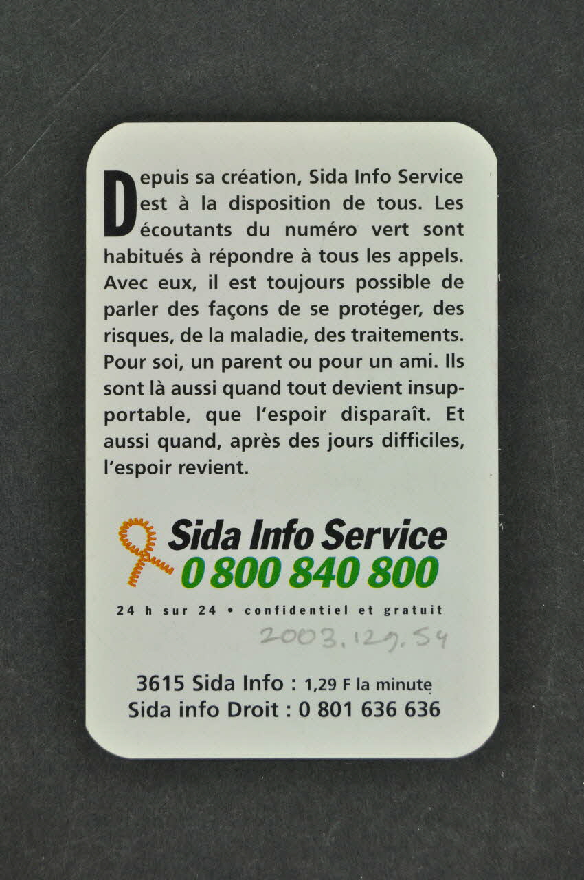 La carte est une carte informative, dite carte mémo. Elle est imprimée sur fond blanc sur ses deux faces, et se lit dans le sens vertical. Au recto, à gauche, est représenté le logo de Sida Info Service: le motif du ruban rouge est repris avec un fil de téléphone rouge en accordéon. En haut, en lettres noires et vertes, le nom et le numéro de téléphone de l'association sont indiqués. Ils sont répétés au bas de la carte. A droite du ruban rouge, en lettres noires et rouges, les missions de l'association sont présentées. Au verso, Un texte en lettres noires reprends les caractéristique de l'association et l'aide qu'elle peut apporter. Dessous, le logo et le numéro de Sida Info Service sont à nouveau indiqués avec, dessous, d'autres coordonnées rattachées à différents services d'aide et d'information.