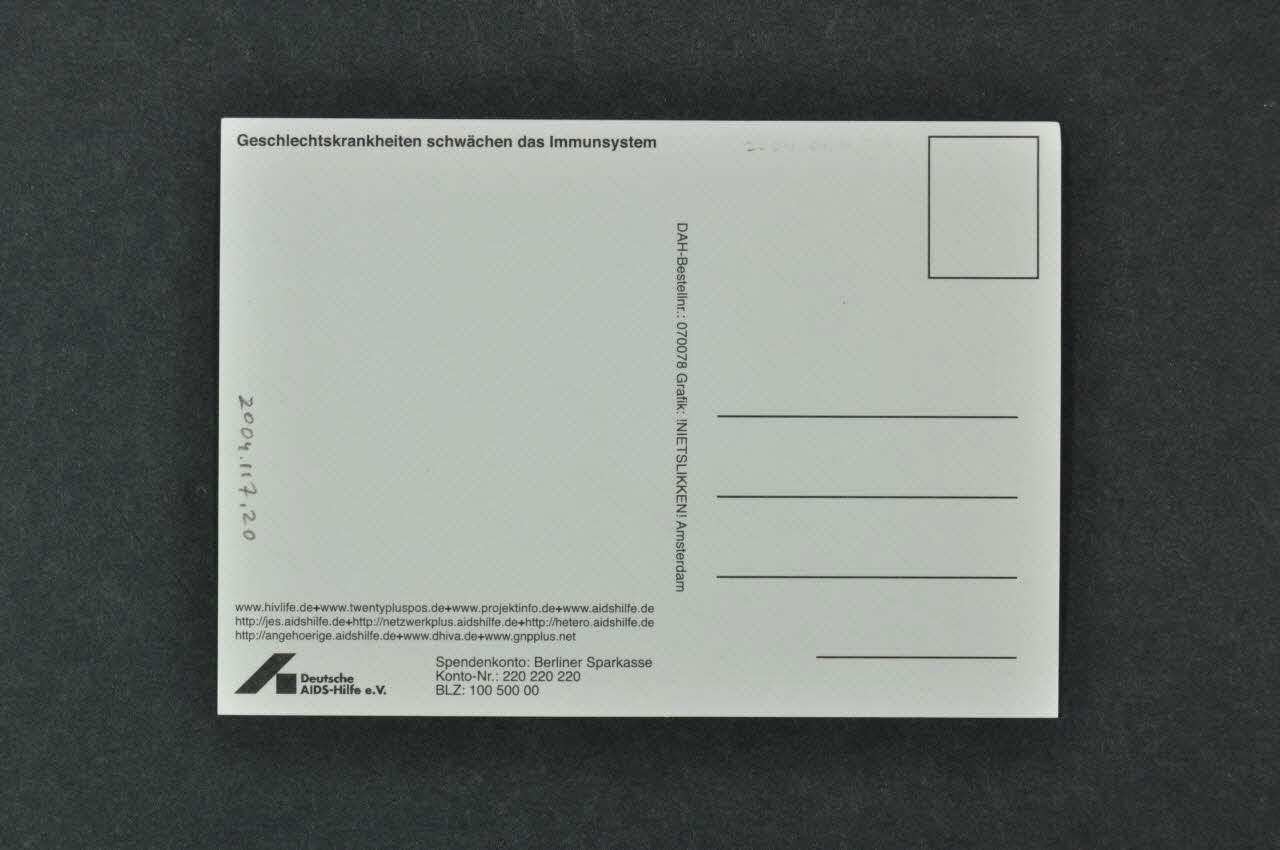 Geschlechtskrankheiten schwächen das Immunsystem (Texte imprimé en caractères noirs sur blanc et situé dans l'angle supérieur gauche), versoDécor