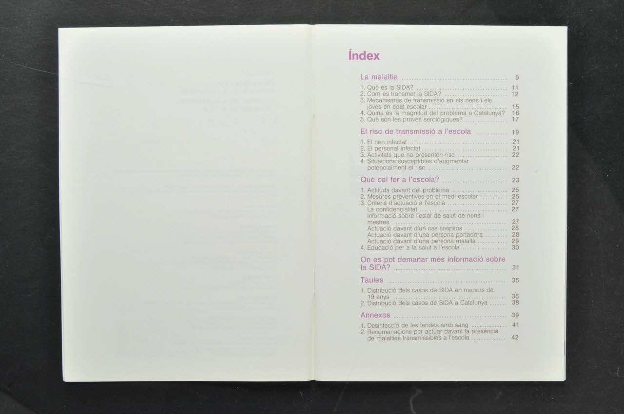 Index // // La malaltia // El risc de transmissió a l'escola // Què cal fer a l'escola ? // On es pot demanar més informació sobre la SIDA ? // Taules // Annexos (page 7)Titre