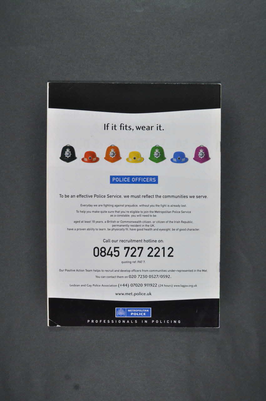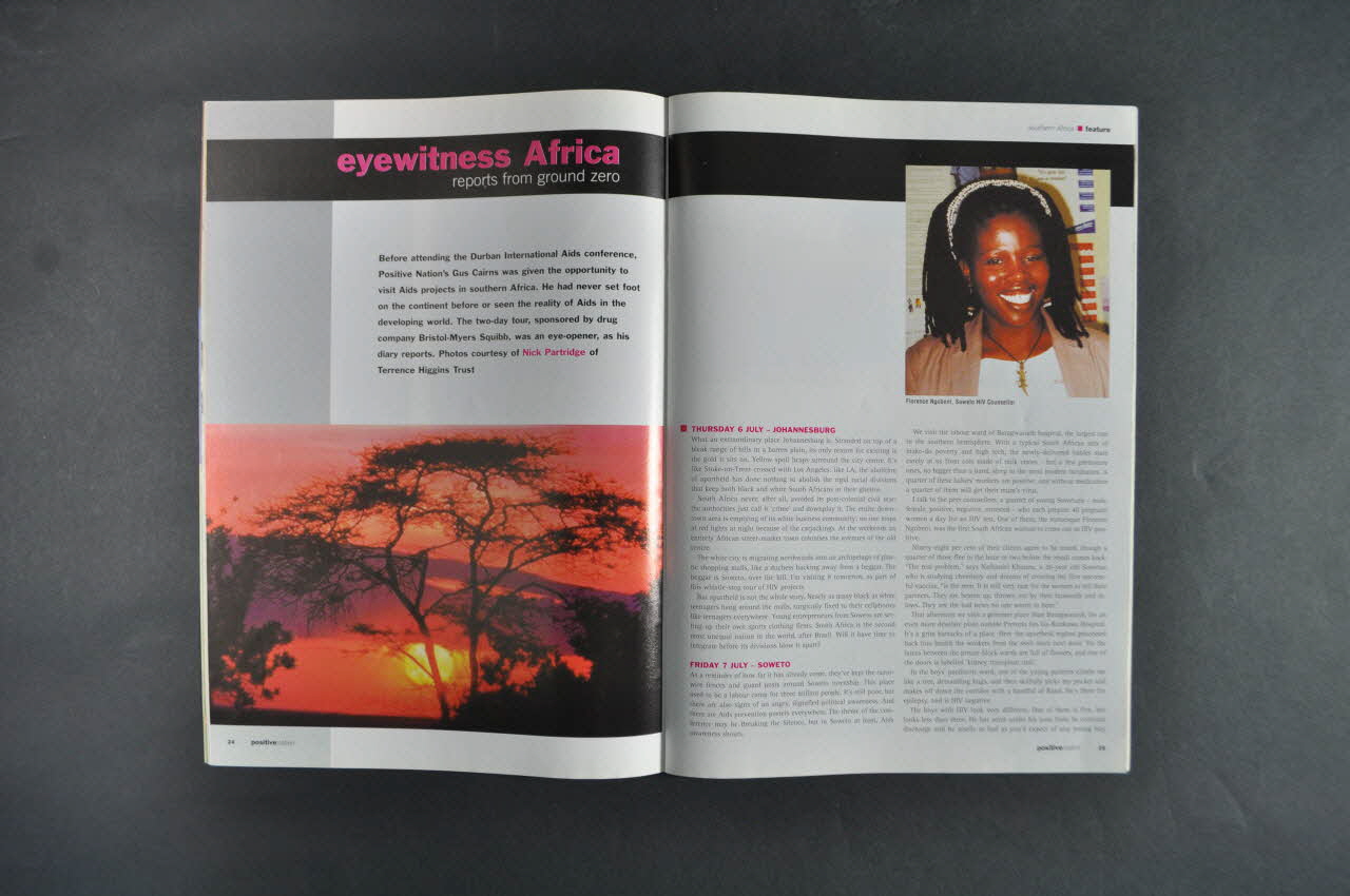 La revue est composée de 66 pages comprises dans une couverture en papier glacé. Il s'agit du numéro 59 de cette collection. Le fond de la page de couverture est constitué de la photographie d'un policier barbu, souriant largement. Au-dessus, le titre de la revue est inscrit en lettres jaunes et vertes. A gauche sont indiqués, en colonne et en lettres vertes et jaunes, les thèmes abordés dans le numéro: le témoignage d'un artiste, avec les photographies d'oeuvres qu'il considère comme des métaphores de sa vie et de l'évolution de sa maladie; un article sur les changements corporels induits par les traitements : les lipodystrophies; un article sur les traitements naturels, l'herboristerie...; un reportage sur l'Afrique par un témoin dont c'est le premier voyage. Le titre principal est annoncé en larges lettres jaunes sous-titrées en vert, en bas de la page. A gauche, sur un bandeau vert, inscrit en blanc, l'annonce que l'encart sur les traitements est augmenté et provient de Terrence Higgins Trust et BMS. La première page présente le sommaire, sur un fond brun clair. Les autres pages sont imprimées de caractères noirs et photographies couleur et noir et blanc. L'organisation du magazine se fait comme suit: trois ensembles d'articles intitulés "features" (portraits), "treatments", et "regulars" (informations régulières). Y sont répartis: des publicités de laboratoires pharmaceutiques; un formulaire à remplir pour le "Positive award 2000"; un article sur les associations françaises, avec des photographies; de courtes informations sur les traitements; de courtes annonces et témoignages (marijuana médicale); un article sur l'homéopathie.