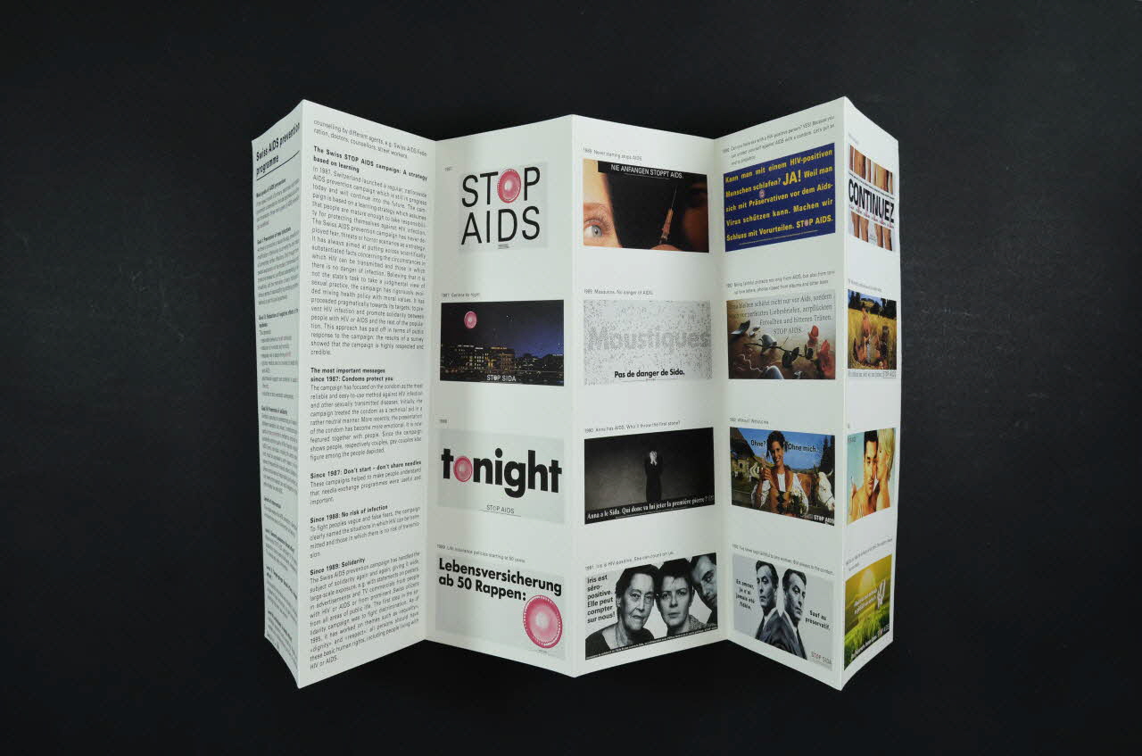 1987 // Stop AIDS // // 1987 Geneva by night // STOP SIDA // // 1988 // Tonight // STOP AIDS // // 1989 // Lebensversicherung // ab 50 Rappen // // 1989 // Nie anfangen stoppt Aids // // 1989 // Moustiques // Pas de danger de sida // // 1990 // Anne a le sida. Qui donc va lui jeter la première pierre ? // // 1991 // Iris est séropositive. Elle peut compter sur nous ! // // 1992 // Kann man mit einem HIV-positiven // Menschen schlafen ?... // // 1992 // Treu bleiben schütz nicht nur vor AIDS... // // 1992 // Ohne ? Ohne mich // // 1993 // En amour je n'ai jamais été fidèle. Sauf au préservatif // // 1993 // Continuez // // 1994 // Wir schutzen uns, weil wir uns lieben. // // 1995 // STOP AIDS // // 1996 // Machst Du mich nochmals so glücklich wie vorher ? // Das Präservativ. Immer dabei. (avant et sur les autocollants), à l'intérieurSommaire