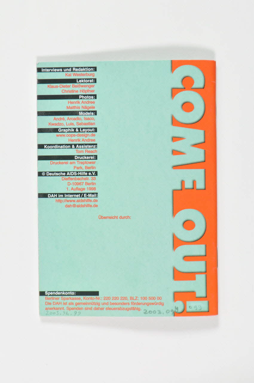 COME OUT! (En bleu-vert sur un bandeau orange vertical), versoAuteur, concernant le lieu d'édition, adresse