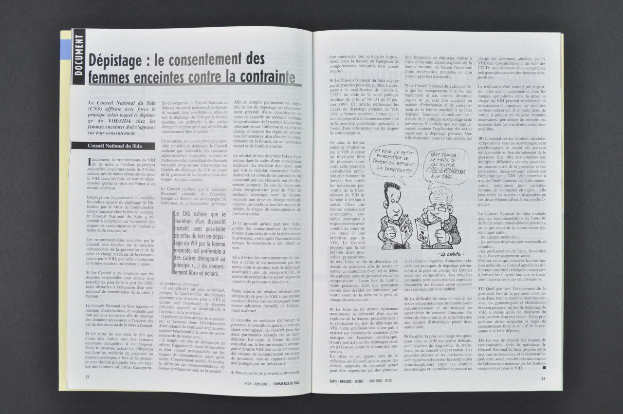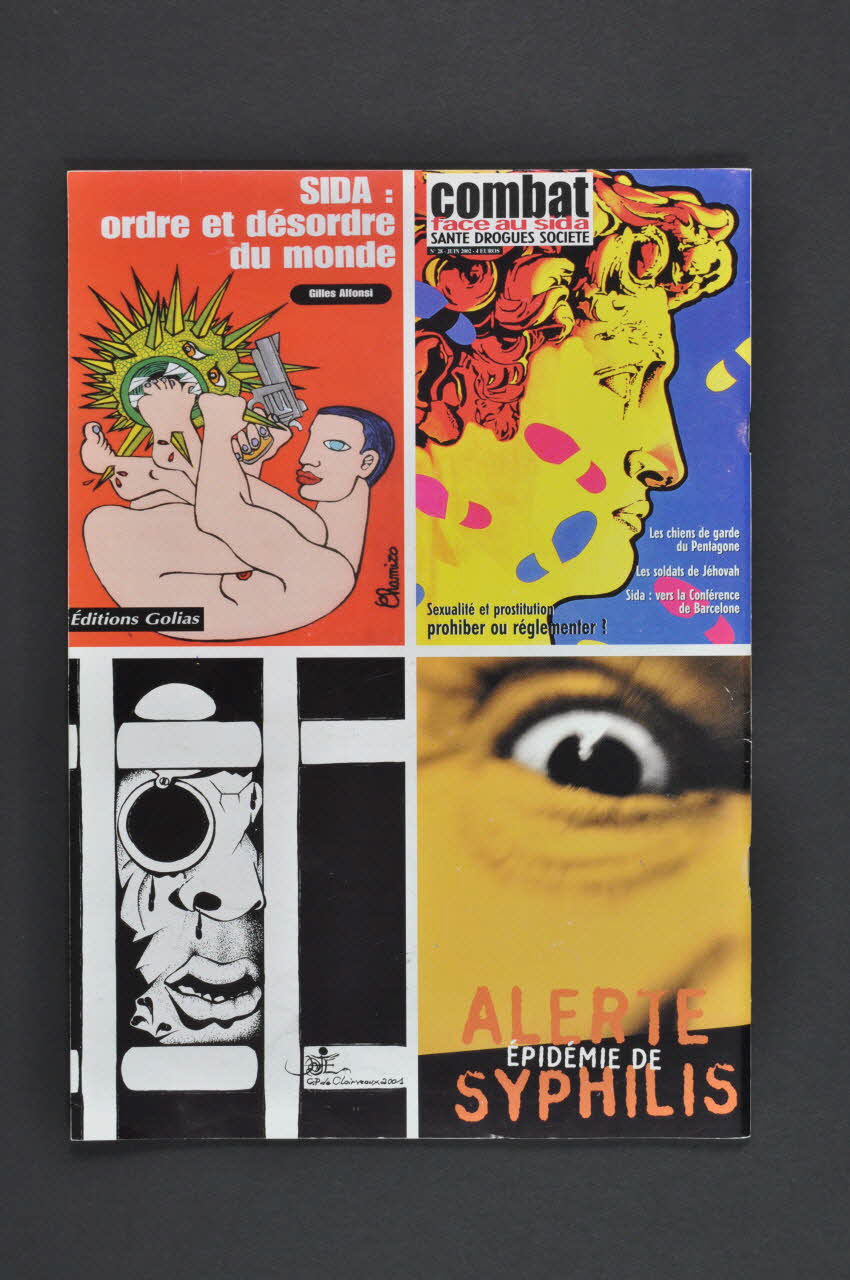 p. 4-5 Gilles Alfonsi, Le "rétablissement de l'ordre", illusoire solution à l'insécurité ("Deux conceptions s'affrontent. La première considère que l'insécurité a comme remède le maintien de l'ordre ; la seconde considère que l'insécurité se combattra principalement par des politiques économiques, sociales et culturelles."... "La proposition de la "préférence nationale" ne fait que renforcer le mal là où il prend sa source : dans les discriminations économiques et sociales dont sont victimes les catégories défavorisées") p. 6-7 Gilles Alfonsi, Les chiens de garde du Pentagone face à l'effroyable imposture (à propos du livre de Thierry Meyssan, président du Réseau Voltaire : contre la diabolisation de l'auteur) p. 8-11 Pascal Damoinet, Gilles Alfonsi, Les soldats de Jéovah au service d'une théocratie (Témoins de Jéhovah, conception conservatrice de la vie sociale, stratégie de communication importante... analyse de leur revue, de leurs tracts...) p. 12-13 Jean-Michel Kahn, Roger Gonnet, Nouvelles technologies, nouvelles armes face aux mouvements sectaires p.14-15 Jean-Luc Guilhem, Torture par emprisonnement jusqu'à la mort (Suicide à Clairvaux de Gérard Gateau, qui avait envoyé des dessins à Combat; 130 suicides de détenus en France en 2001; projet de loi pénitentiaire aux oubliettes...) p.16-17 Sophie Bizet, Recherche ouvriers handicapés corvéables à merci (dérive des Centres d'Aide par le Travail, "en passe de devenir des entreprises comme les autres, au détriment d'une part de l'insertion des handicapés en milieu ordinaire, d'autre part de l'accueil d'handicapés plus lourds dans ces centres qui leur étaient initialement destinés") p. 18-21 Hubert Lisandre, Le paradoxe du menteur (Bilan : La prévention à jamais sourde à l'inconscient ; mauvais accueil de Lisandre dans les milieux de la prévention et de la recherche; la prévention n'est pas uniquement affaire de volonté et d'information mais aussi de désir; déni du désir; la prévention faite de répétitions, d'anathèmes...) p.22-3 Conseil National du Sida, Dépistage : le consentement des femmes enceintes contre la contrainte (recommandations du Conseil National du Sida selon lequel le dépistage du VIH/SIDA chez les femmes enceintes doit s'appuyer sur leur consentement) p. 24 Notes de lecture p. 25-31 Les enjeux de la Conférence Internationale de Barcelone - Peter Piot, directeur exécutif du programme des Nations Unies contre le sida, Le sida n'est pas une affaire de charité (le sida est une menace pour la croissance économique et la stabilité mondiale; 10 milliards de dollars chaque année nécessaires pour le Fonds mondial) - Des traitements pour tous ( carte mondiale de l'épidémie du VIH/SIDA qui recouvre celle des inégalités du développement économique et social) - Jacqueline Dérens, Le front de la lutte contre le sida en Afrique du sud (mobilisation des militants du TAC (Treatment Action Campaign); inflexion de la politique du gouvernement sur la politique de prévention de la transmission de la mère à l'enfant) - p 33-41 Dossier : Sexualité et prostitution : prohiber ou réglementer? - Gilles Alfonsi, Réprimer, contrôler ou normaliser la prostitution? - Fabrice Boudinet, coordinateur prévention et réduction des risques à Aides Paris, Prostitution et identité sexuelle : la prostitution face à la personne (interventions auprès des prostitués masculins de la place Dauphine ) - Entretien avec Camille Cabral, directrice du PASTT (Prévention Santé Travail pour les Transgenres), Transgenres : contre la discrimination (contre le prohibitionnisme; présentation de l'association) - Janine Mossuz-Lavau, Il n'existe pas de normalité sexuelle p 42-3 Pascal Damoinet, Grégory Halberda, Le système sportif : une machine idéologique p. 44-7 Jean-Luc Guilhem, Attention posthume à Richard Durn ("Quelle peut être la part de responsabilité de la société dans la naissance, le développement et l'évolution finale de ses troubles") p. 48-9 Agnès Deurveilher, Filmer la misère, documenter les relations humaines p. 50 Hommage : dernier dessin de Gérard Gateau, mort à Clairvaux le 7 mai 2002 (noir et blanc : une tête derrière les barreaux, larmes) p. 51 et dos de couverture, 4 dessins et textes qui sont repris en tracts séparés : livre Sida ordre et désordre du monde; bulletin d'abonnement; suicide de Gérard Gateau; test de syphilis