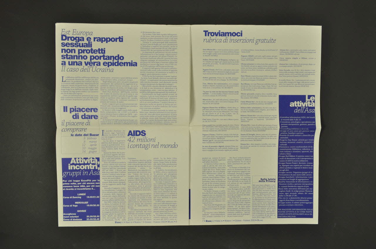 Essepiù / Anno XII . Numero 1 . Gennaio - Febbraio 2003 . ASA . Associazione Solidarietà AIDS . Milano / Anno nuovo / Vita nuova? / Tra piscine, cene, / vacanze e amici. / Nonostante l'HIV / In questo / numero / KENIA : IGNORANZA / E PREGIUDIZIO / REMANO CONTRO / LA LOTTA ALL'AIDS / MANGIARE / DURANTE / I MOMENTI / DI CRISI / I TRATTAMENTI / COMPLEMENTARI / Essepiù / Bimestrale dell'ASA / Associazione Solidarietà AIDS (Sur toute la page.), sur la couvertureTexte