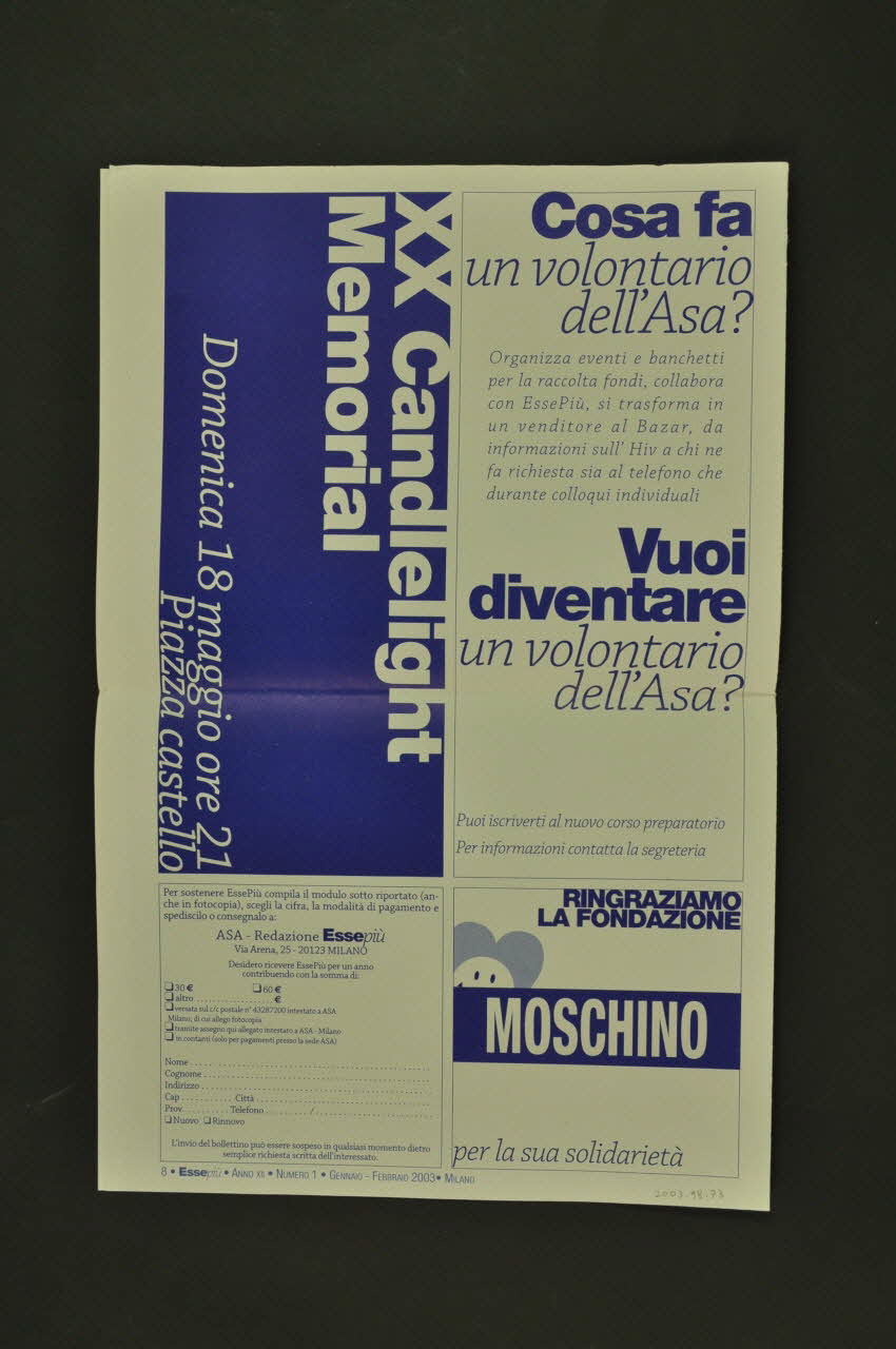 XX Candlelight / Memorial [...] // // [...] ASA - Redazione EssePiù / [...] // // Cosa fa / un volontario / dell'ASA? [...] // // RINGRAZIAMO / LA FONDAZIONE / MOSCHINO / per la sua solidarietà (En quatrième de couverture. Au sein de quatre encadrés distincts.), versoDécor
