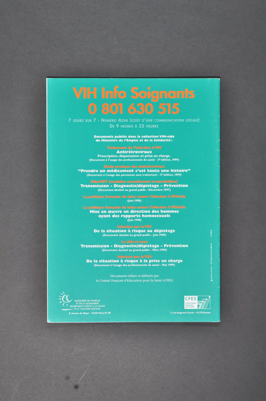 VIH Info Soignants // 0 801 630 515 (En haut, en caractères oranges), versoTexte