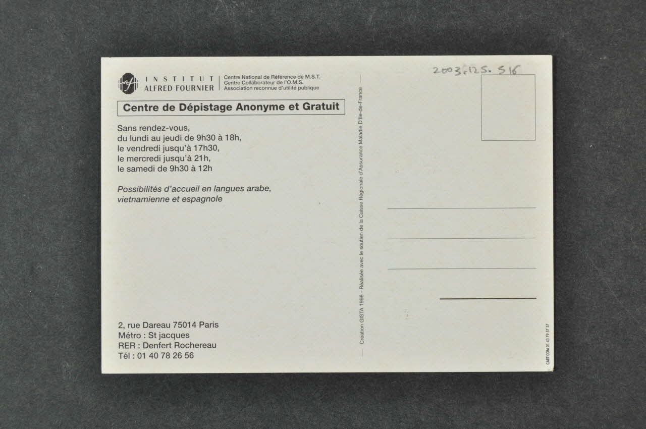 INSTITUT // ALFRED FOURNIER // // centre national de Référence de M.S.T. // Centre collaborateur de l'O.M.S. // Association reconnue d'utilité publique // // centre de depistage anonyme et gratuit (en haut à gauche), versoINSTITUT // ALFRED FOURNIER // // centre de depistage // anonyme et gratuit (en bas), rectoDécor