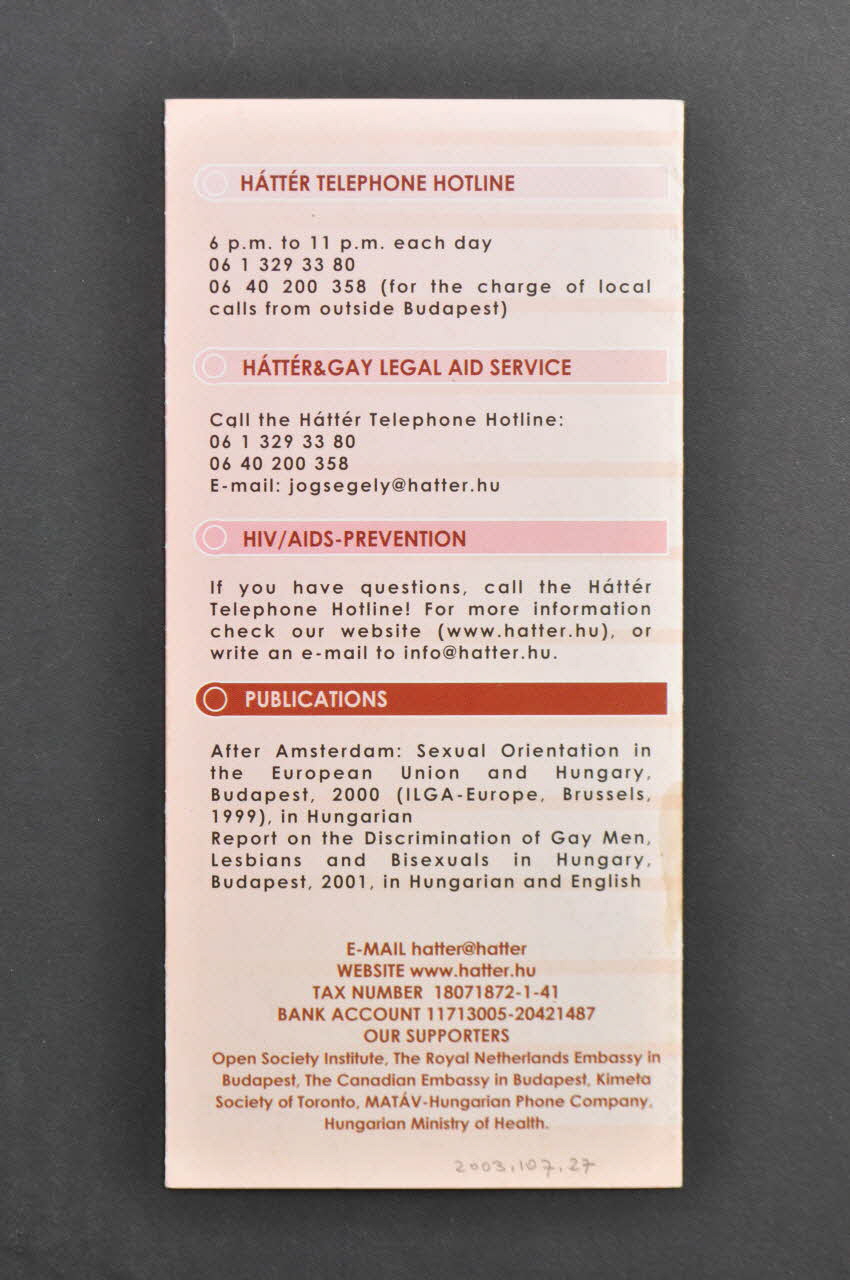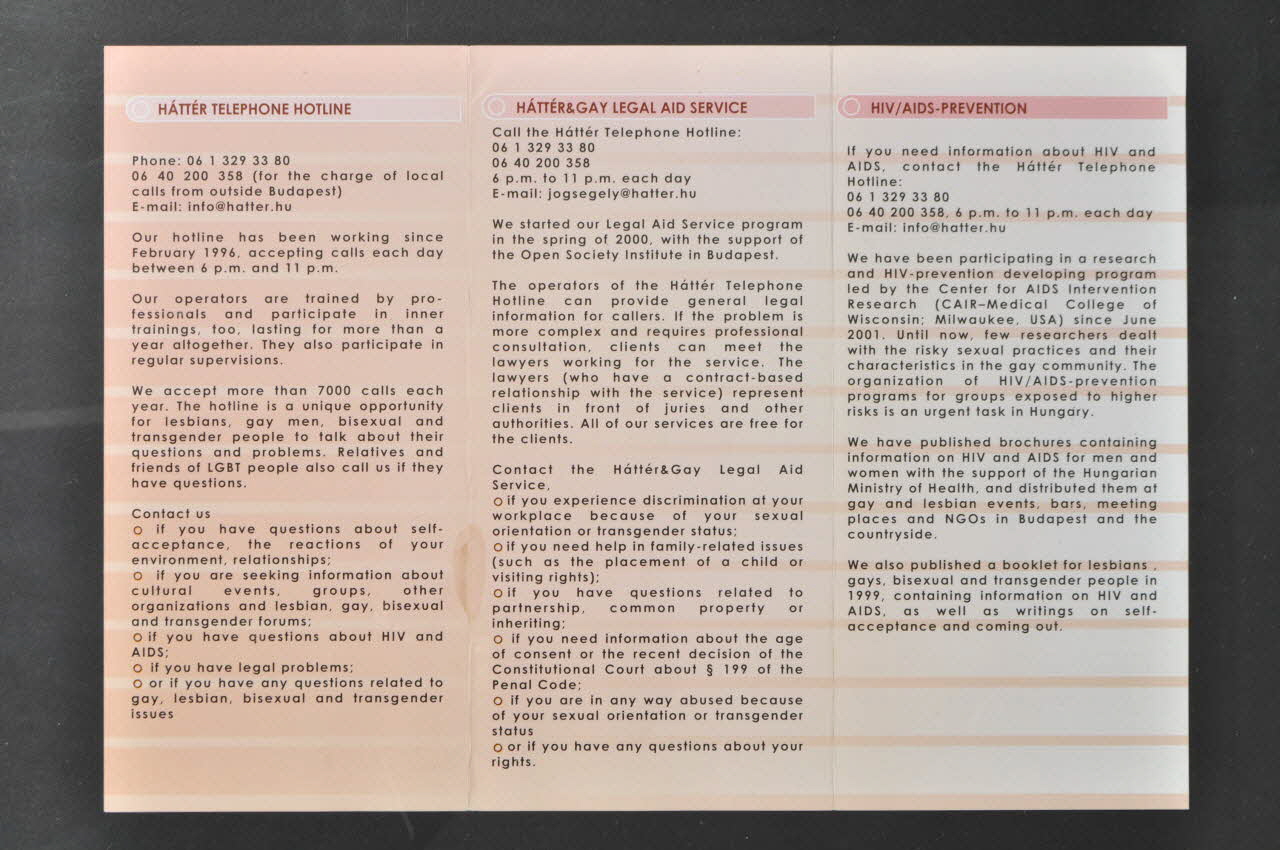 - Ligne téléphonique de Hatter (depuis février 1996 : questions sur l'homosexualité, questions juridiques, questions sur le VIH/Sida)