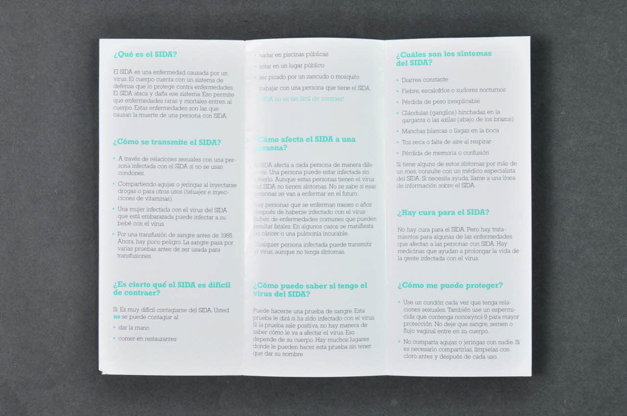 Informarse es // la mejor defensa // contra el SIDA (En blanc sous le titre.), sur la couverture?Qué es el SIDA? // // ?Como se transmite el SIDA? // // ?Es cierto qué el SIDA es dificil // de contraer? // // ?Como afecta el SIDA a une // persona? // // ?Como puedo saber si tengo el // virus del SIDA? // // ?Cuales son los sintomas // del SIDA? // // ?Hay cura para el SIDA? // // ?Como me puedo proteger? (En vert sur les trois volets intérieurs.), à l'intérieurTexte
